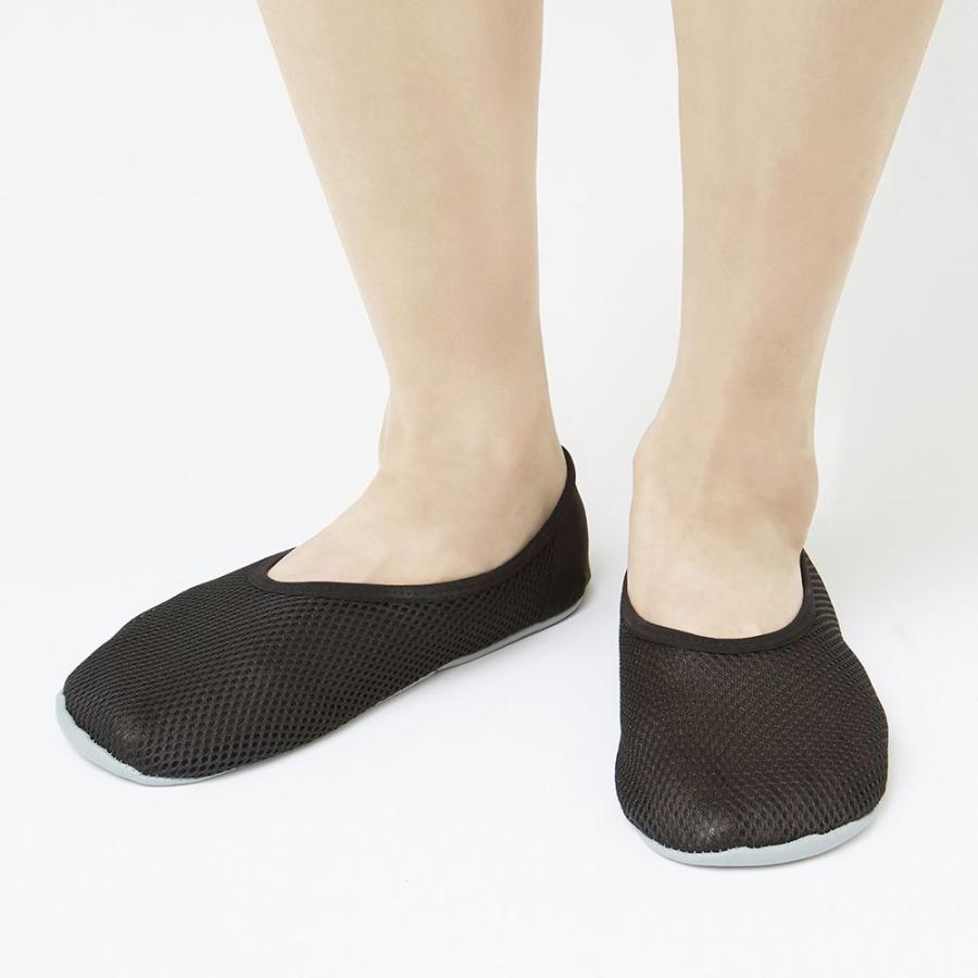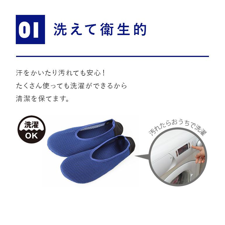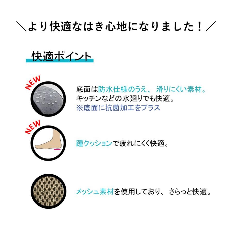 メッシュ素材で、サラッとムレにくい。かかとは脱げにくく、着脱しやすいストレッチ素材を使用。足裏は防水仕様のすべりにくい素材で安心。リニューアルでかかとにクッションと抗菌防臭加工プラス。お家で洗えて衛生的に。
