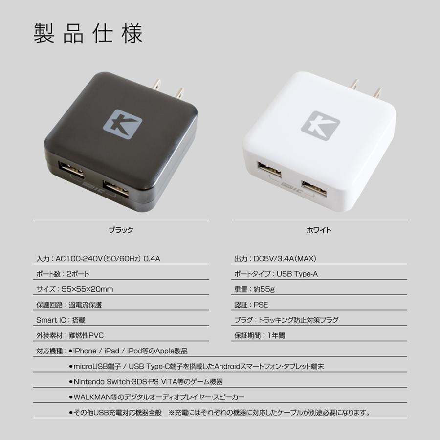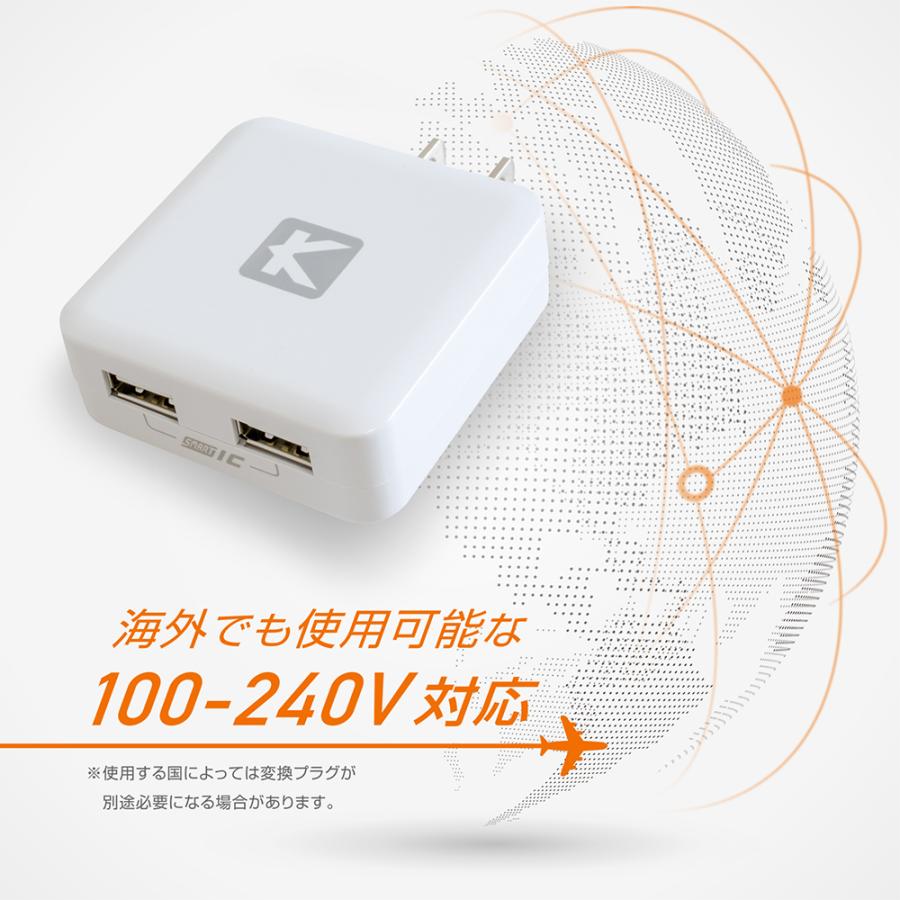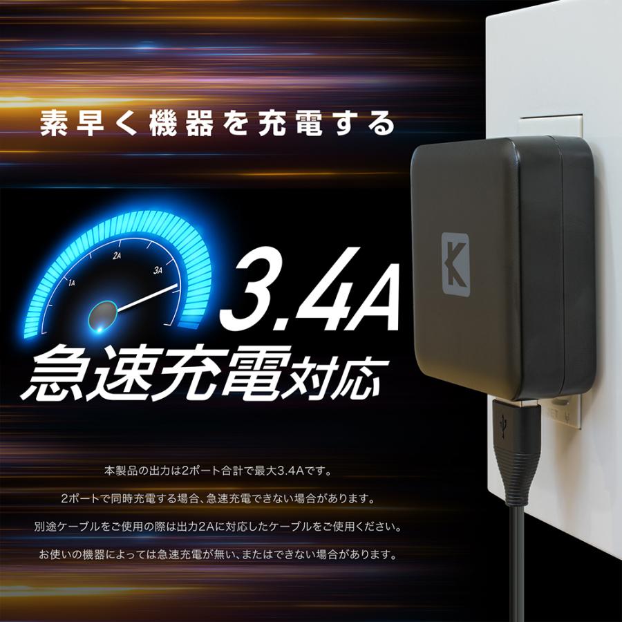 スマートフォンやタブレットを最大3.4A出力で急速充電でき、スマートフォン2台充電はもちろん、タブレットとも同時に充電が可能です。(ただし、合計3.4Aまで)