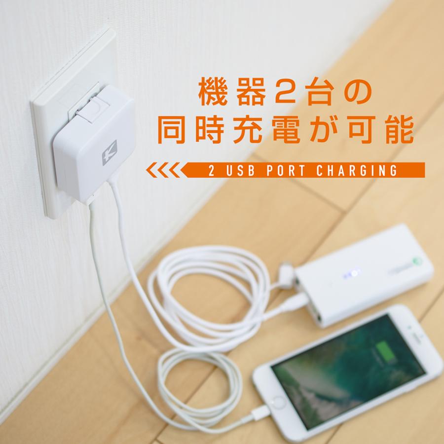 USB Aポートを2ポート搭載していますので、機器2台を同時に充電できます。