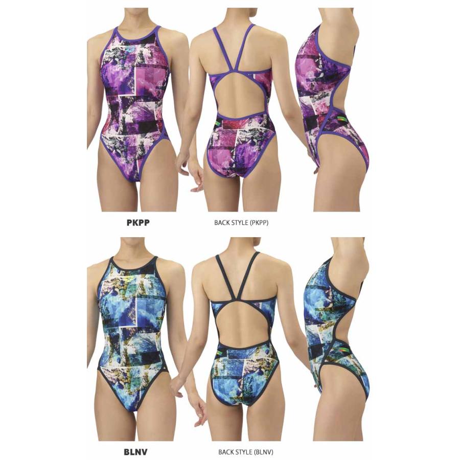 トレーニングカテゴリー「TOUGHSUITシリーズ」。大会に向けて練習を重ねる頻度が高いスイマーにオススメの練習用水着。環境に配慮したリサイクルポリエステル素材「タフスキンT2E」を使用し塩素に強く長持ち。シーズンテーマのWAVESの総柄ワンピースタイプ。岩礁にぶつかり合う波が自然のエネルギーを感じさせてくれるデザインを4配色で表現。前身頃、後身頃共にYLBK、BLNVは黒、GRGRはミント、PKPPはピンクの裏地付き。