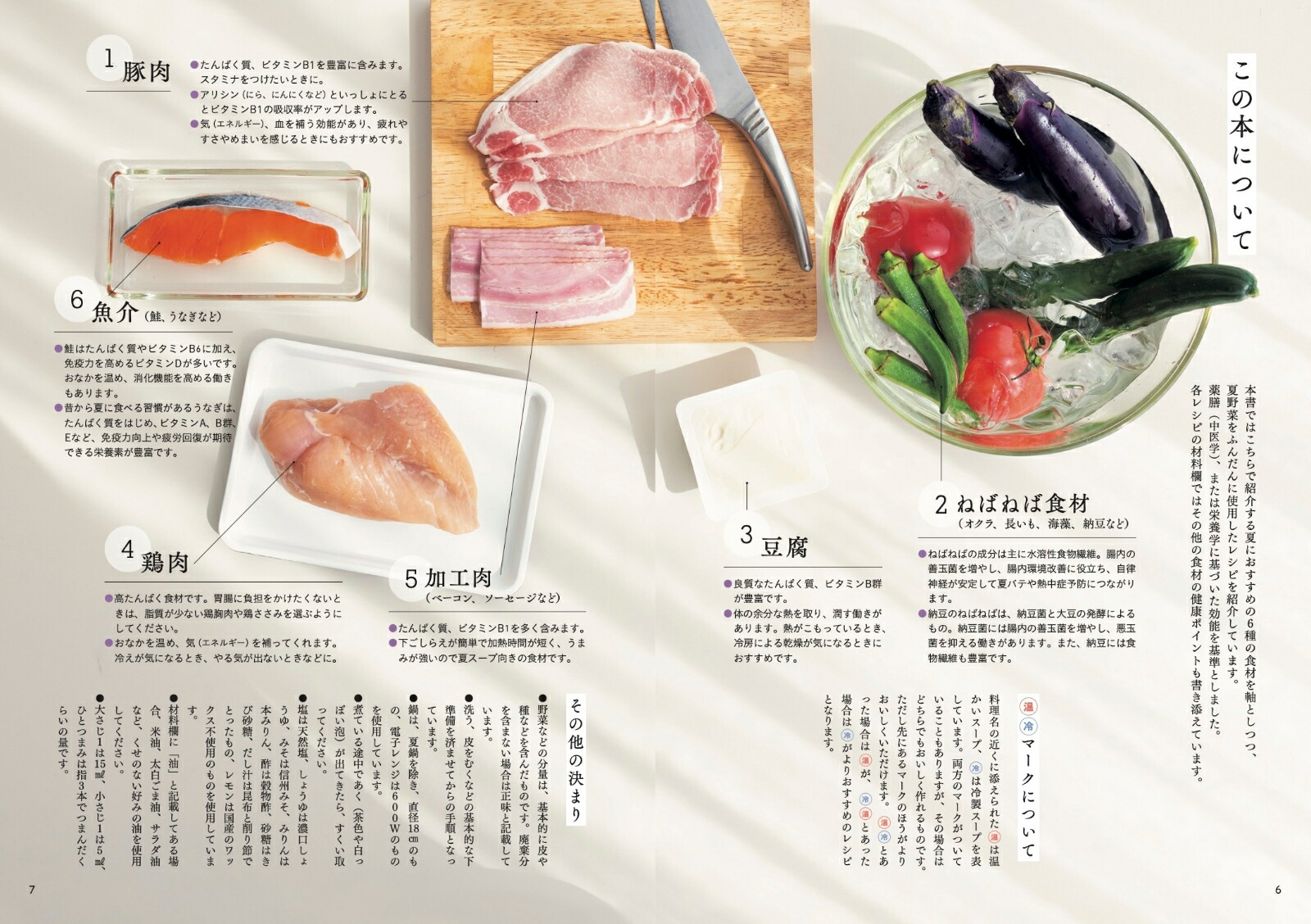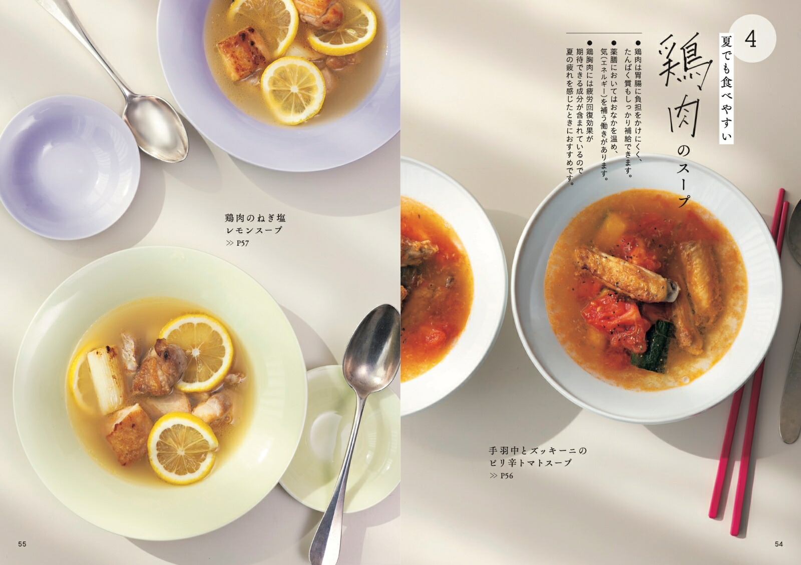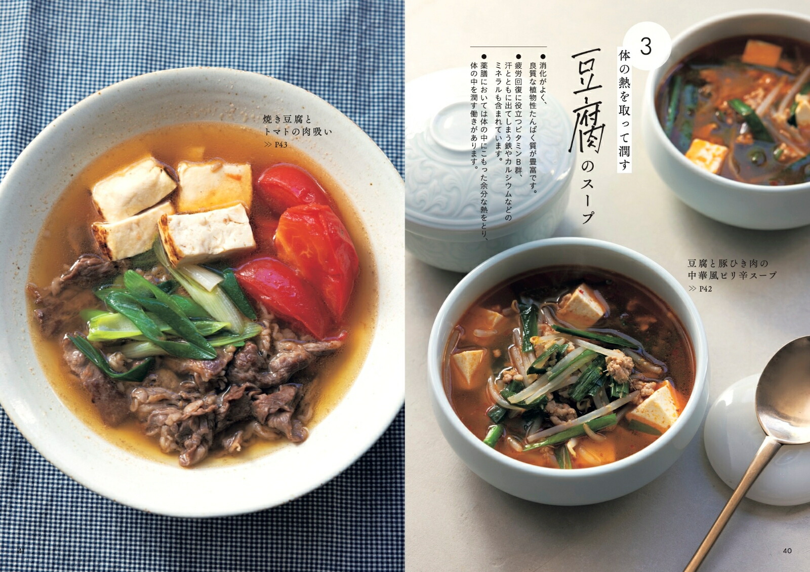 1 夏バテに効く 豚肉のスープ/2 夏の体を整える ねばねば食材のスープ/3 体の熱をとって潤す 豆腐のスープ/4 夏でも食べやすい 鶏肉のスープ/5 ベーコン、ソーセージ、生ハム 加工肉のスープ/6 夏の弱った胃腸にやさしい 魚介のスープ/夏鍋はいかが?/フルーツスープをぜひ!