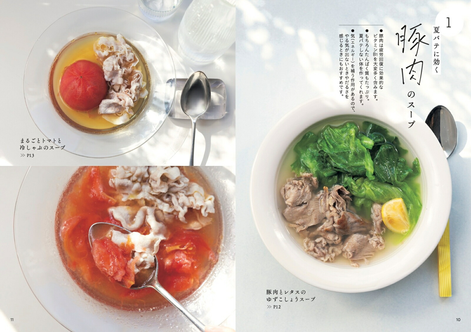 夏が過酷になりつつある今だからこそ、夏野菜の力が必要です。そして夏野菜を、もっとも簡単に、もっともおいしく食べることのできる料理が、スープなのです。スープというと「寒い季節に食べるもの」というイメージが強いかもしれませんが、夏にこそスープを積極的に食べていただきたいのです。夏バテぎみで食欲がないときでも、スープであればするりと食べることができます。作るのだって簡単。食材を鍋に入れて火を通せばできあがりです。暑くてあれこれ料理をしたくないときに、ひと皿でたんぱく質からビタミン、ミネラル、食物繊維と、さまざまな栄養素をとることができますし、汁まで飲み干せば十分な満足感も得られることでしょう。一方では強すぎる冷房によって体が冷えてしまうのも困りものです。そんなときのために、冷えてガチガチに固まってしまった体をほぐしてくれるスープのレシピも、本書には数多く収録しました。外気の暑さと室内の寒さ。どちらも体には大きな負担となりますが、スープがあれば安心です。薬膳においてトマトやきゅうり、冬瓜といった夏野菜には、体の熱を取り、潤いをもたらすといった効能があります。栄養学的にもトマトは抗酸化成分を多く含み、紫外線のダメージから肌を守ってくれますし、なすに含まれるナスニンには老化や疲労の原因となる活性酸素を減らす働きがあります。そんな夏野菜をふんだんに使いながら、肉や魚介、豆腐などで、たんぱく質もしっかりとれるスープを本書では紹介しています。温かいスープも、冷たいスープも、どちらにしてもおいしいスープもありますので、体調や気分に応じて作り分けてください。長くつらいこの季節を健やかにのりきるために、本書を活用していただけましたら幸いです。