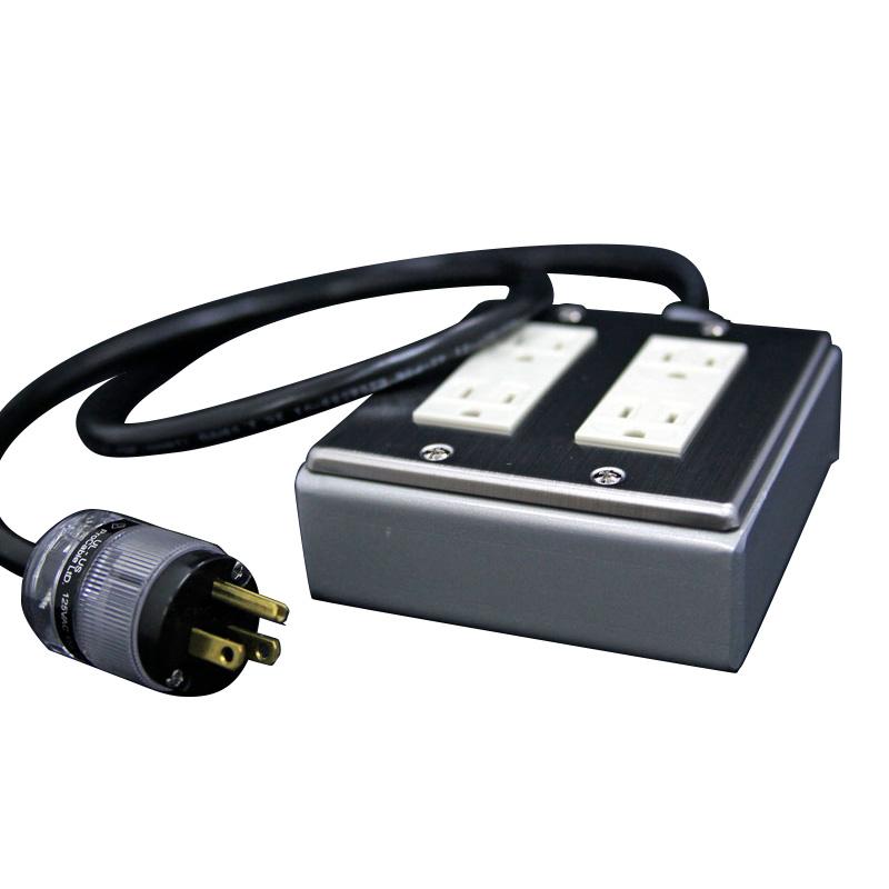 シールド金属(鋳鉄から割れにくい鉄板へと進化しております)ボディー、及びシールド電源ケーブルです。鉄の厚みは、全箇所3.2mmほどにも及ぶ、これでもか!、というほど、分厚い鉄板を使用して制作してもらっております。重量約1.41キロの化け物です(ケーブル長1.0mの場合)。ノイズの通過する余地は、ありません。「本物の米国ワットゲートプラグ、&、シールドケーブル、&、鉄の本体強力シールド」です。