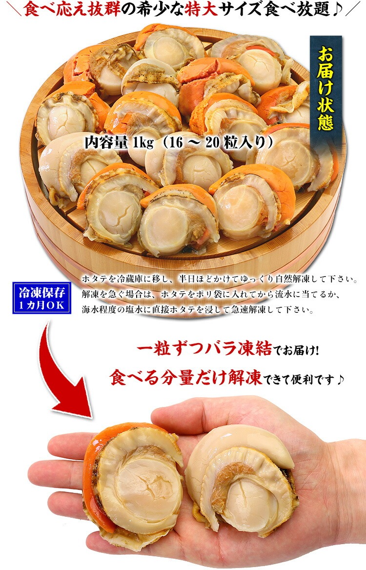 商品のポイント:北海道の南西部に位置する噴火湾。いくつもの川から豊富な植物性プランクトンが流れ込み、栄養環境に優れていることから、国内有数の帆立の生産地と言われています。北海道の冷たい海の中で育った帆立は身の締りが良く、甘みが強いのが特徴です。また、今回はほとんど市場に出回らない特大サイズを厳選しておりますので、食べごたえも抜群で、ボリューム満点!ボイル帆立は調理方法が多彩で、メインのおかずとしてもよし、おつまみや一品料理としてもおすすめです。加熱すると帆立は甘みを増し、良い出汁が出てきます。ソテーはもちろんのこと、鍋やシチューなどの煮込み料理にも相性抜群。