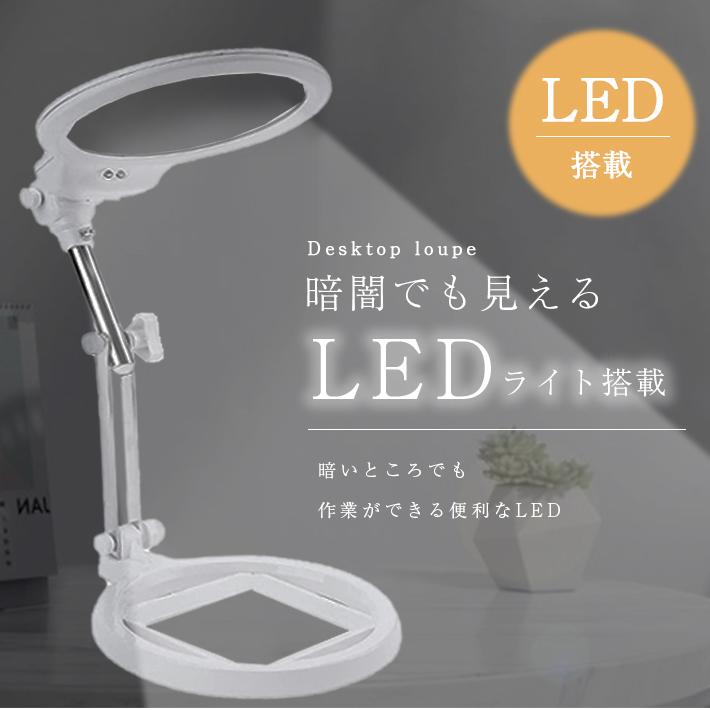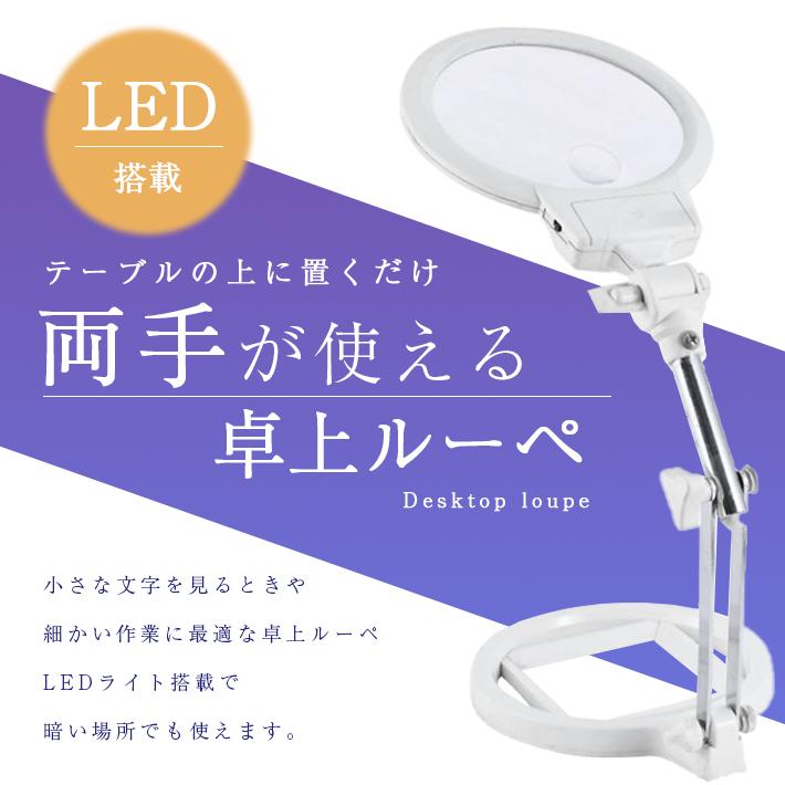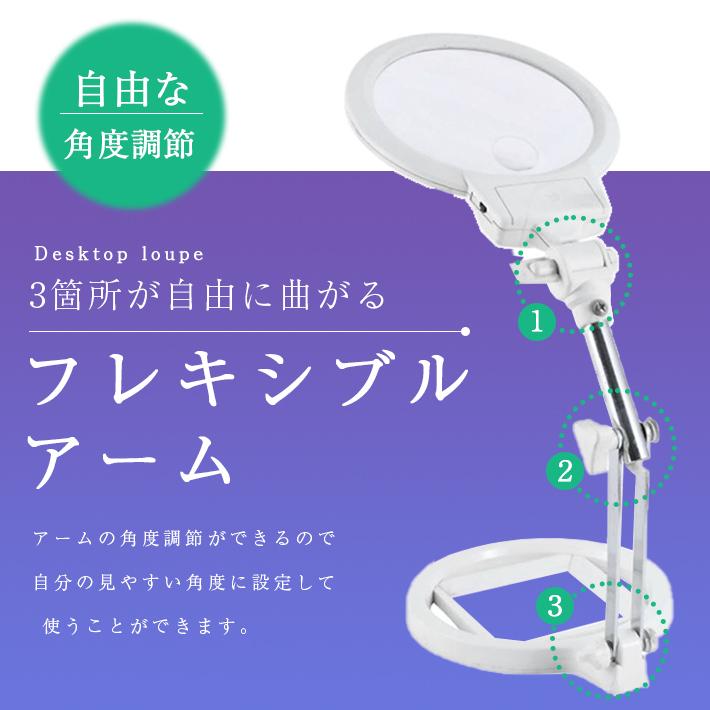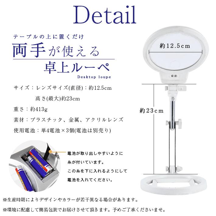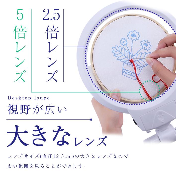 【商品概要】デスクの上で大活躍!LEDライト付きの卓上ルーペです。裁縫、刺繍、読書、プラモデル、手芸など細かい作業でも大丈夫。大きめレンズで手元がよく見えます。倍率は5倍と2.5倍仕様。3箇所稼働のフレキシブルアームで、角度調整も自由自在です。【サイズ】レンズサイズ(直径):約12.5cm高さ(最大)約23cm【素材】プラスチック、金属、アクリルレンズ【重さ】約413g【使用電池】単4電池×3※電池は付属しません。別途お買い求めください。