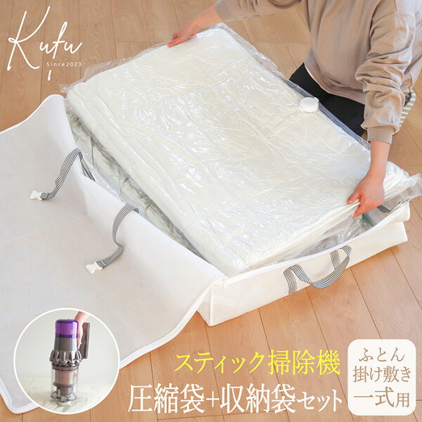 ●掛け布団・敷き布団を1枚ずつ圧縮できる圧縮袋と専用収納袋のセットです。 ●まとまらない圧縮袋をスッキリ収納し、すべり落ちを解消します。 ●押入れはもちろん、家具の隙間などの空きスペースにも収納できます。 ※立てて収納できますが、自立するわけではありません。 ●スティック掃除機に対応しています。(外してハンディになるタイプもOK) ●コード式掃除機(キャニスタータイプ)にも対応しています。 ●やわらか立体弁バルブ(特許申請中)で、多くの掃除機タイプにフィットして圧縮できます。 ●掃除機ノズルをあてるだけの簡単圧縮。 ●圧縮袋本体にスライダーを取り付けているので、なくしたりせず便利です。 ●収納袋は軽くて丈夫な不織布素材。上ブタ開き式・両開きファスナーで、中身の出し入れがしやすいです。