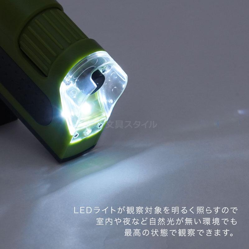 ポケットに入れて持ち歩くことができ、サッと取り出し片手で操作できるコンパクトな顕微鏡です。単三乾電池1本でも明るく光るLEDライト付で室内や夜でも観察できます。