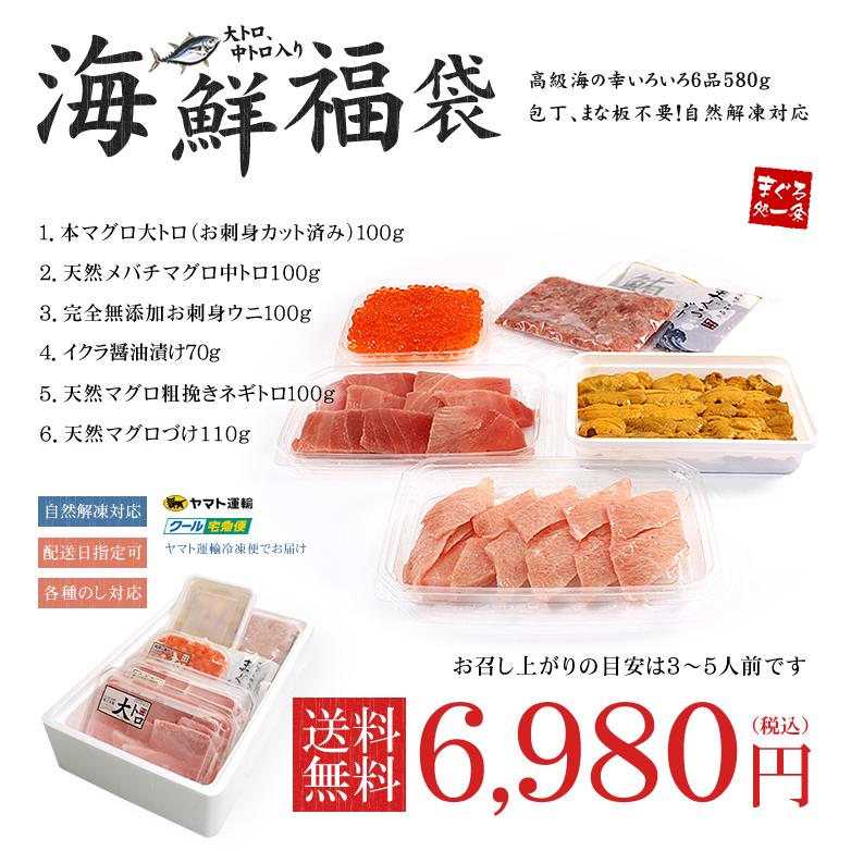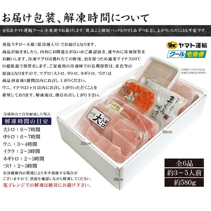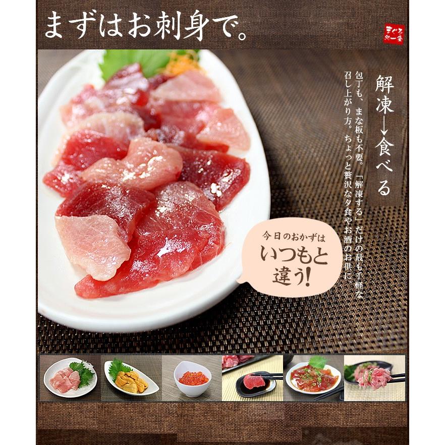 ■内容量:本鮪大トロ100g、メバチマグロ中トロ100g、無添加お刺身ウニ100g、いくら醤油漬け70g、天然マグロネギトロ100g、天然マグロづけ110g