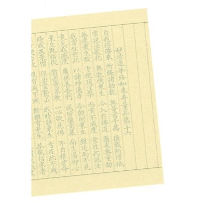 たくさんお書きになる方、またお知り合いと分けられる方に。お得な100枚包みです。寿量品 「妙法蓮華経如来寿量品第十六」 写経用紙です。100枚包みで、手本は付いています。色は、未晒(きなり)で楮紙系の和紙なので、にじみは極小、書きやすいです。寸法:26×57.5cm商品の形態は、折らない延べのままです。ヤマト運輸 宅急便での発送です。