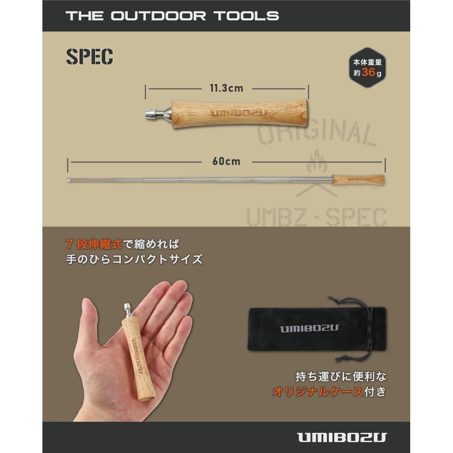●携帯に便利な7段伸縮式で全長は最小11.5cm〜最大は59.5cm、火元から十分な距離を保てます。