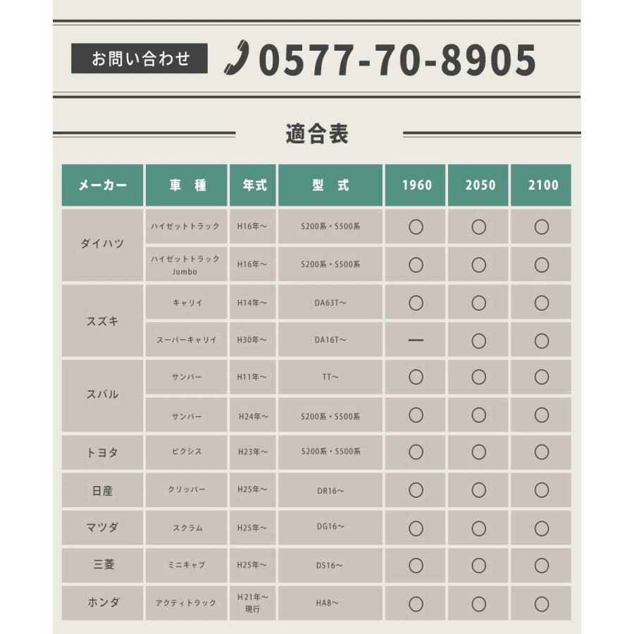 適合車種 ハイゼットトラックH16年〜S200系・S500系ハイゼットトラックJumbo H16年〜 S200系・S500系キャリー H14年〜 DA63T〜スーパーキャリー H30年〜 DA16T〜サンバー H11年〜 TT〜サンバー H24年〜 S200系・S500系ホンダ アクティトラック H21年〜現行 HA8〜