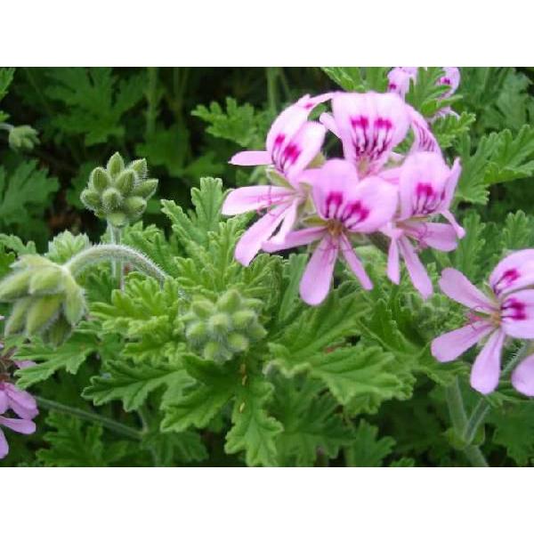 Rose Geranium学名:Pelargonium graveolensフウロソウ科 テンジクアオイ属 多年草蚊が寄り付きにくい香りを持つハーブとして有名です。水はけのよい土に植えて、お日様に当ててあげれば、また可愛らしいピンク色の花を見ることができます。高さ20〜100cmくらいになる多年草です。耐寒性はありませんが、寒冷地の冬でも適度の光と気温があれば、優しい香りと可憐な花を楽しむ事ができます。【栽培】日当たりがよく、風通しの良いところを好みます。水はけのよい土を好みます。
