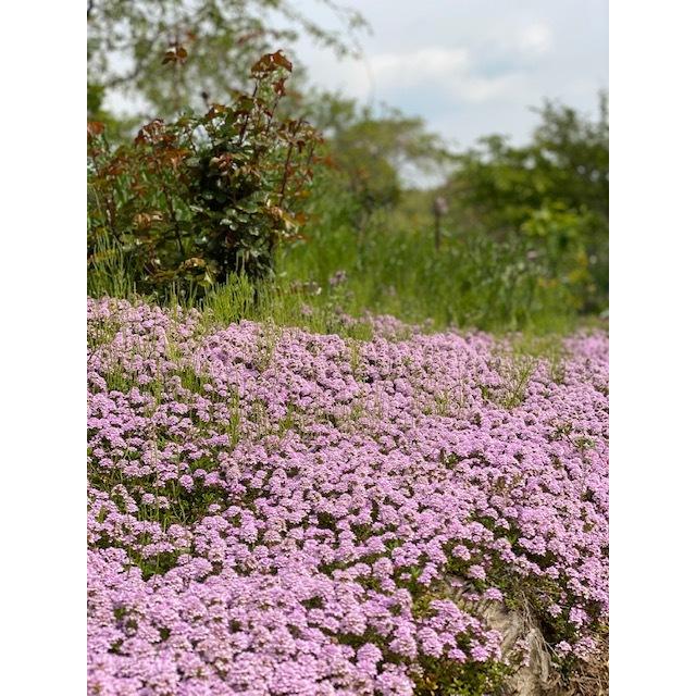 Thyme学名:Thyme herba-baromaシソ科 イブキジャコウソウ属 常緑小低木30cmくらいの間隔で植えつけ、しばらくすると綺麗な香りのグランドカバーが出来上がります。雑草も生えにくくなるのでおすすめのハーブです。クリーピングタィムよりもやや細い葉は、キャラウェイのような香りがします。織毯のように広がり、春、枝先にピンク色の花をつけます。【栽培】日当たり、水はけがよく、乾いた場所を好みます。お花が終わったら、刈り取ります。