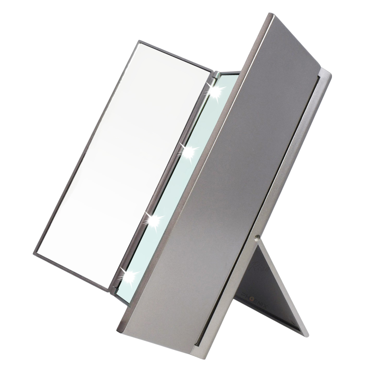 ●暗い場所でもお顔を明るく照らしてくれる 8つのLEDライト付きのコンパクト三面鏡です。