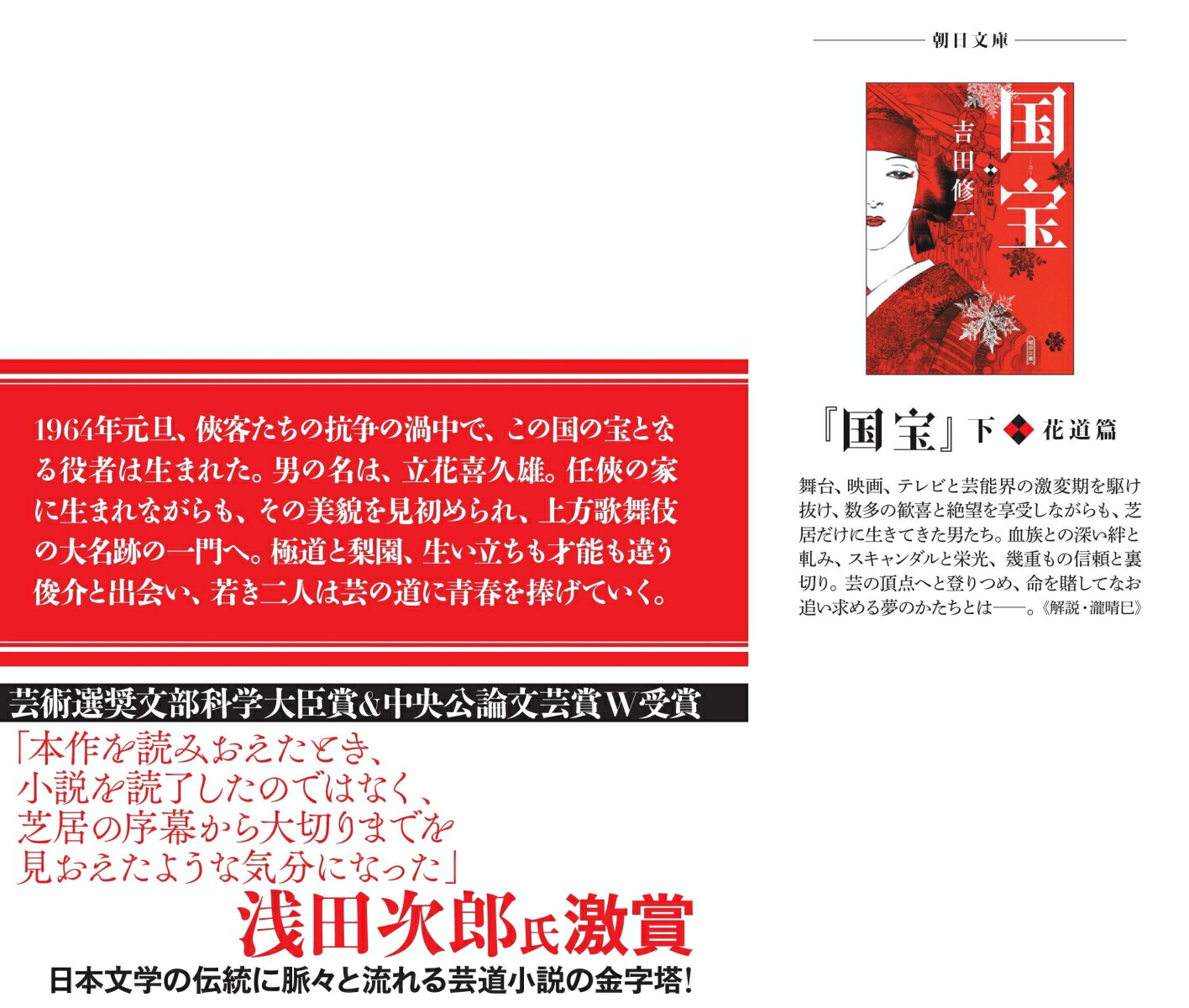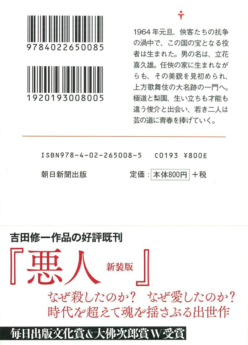 俺たちは踊れる。だからもっと美しい世界に立たせてくれ! 極道と梨園。生い立ちも才能も違う若き二人の役者が、芸の道に青春を捧げていく。芸術選奨文部科学大臣賞、中央公論文芸賞をW受賞、作家生活20周年の節目を飾る芸道小説の金字塔。1964年元旦、長崎は老舗料亭「花丸」--侠客たちの怒号と悲鳴が飛び交うなかで、この国の宝となる役者は生まれた。男の名は、立花喜久雄。任侠の一門に生まれながらも、この世ならざる美貌は人々を巻き込み、喜久雄の人生を思わぬ域にまで連れ出していく。舞台は長崎から大阪、そしてオリンピック後の東京へ。日本の成長と歩を合わせるように、技をみがき、道を究めようともがく男たち。血族との深い絆と軋み、スキャンダルと栄光、幾重もの信頼と裏切り。舞台、映画、テレビと芸能界の転換期を駆け抜け、数多の歓喜と絶望を享受しながら、その頂点に登りつめた先に、何が見えるのか? 朝日新聞連載時から大きな反響を呼んだ、著者渾身の大作。
