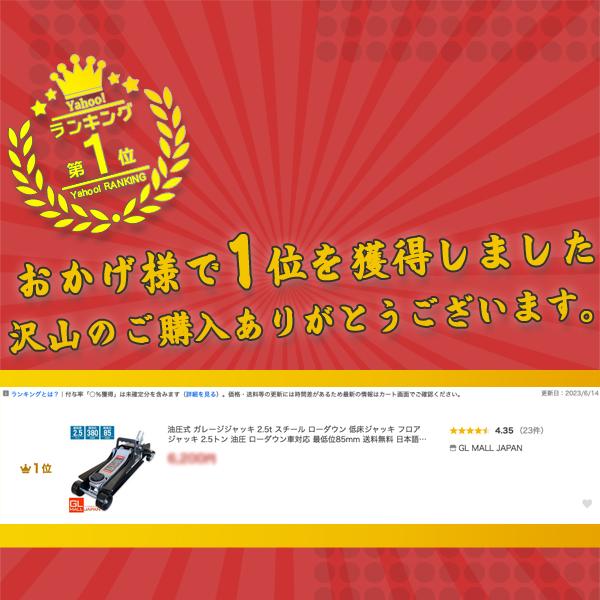 ■新仕様2.5tタイプ■ローダウン車にも対応■ハイパワーの2.5t■保護パッド付きで傷からカバーし滑り止めにもなります■持ち運びに便利なコンパクトサイズ■ベアリングキャスターで移動スムーズ■85mm〜380mmまで稼働■日本語説明書付属本体サイズ:約560(横幅)×180(正面幅)×170(高さ)mm最大耐荷重:2.5t最高位:約380mm最低位:約85mmハンドル長:約500mm重量:約13kg※作業時は必ずジャッキスタンドを併用してください。