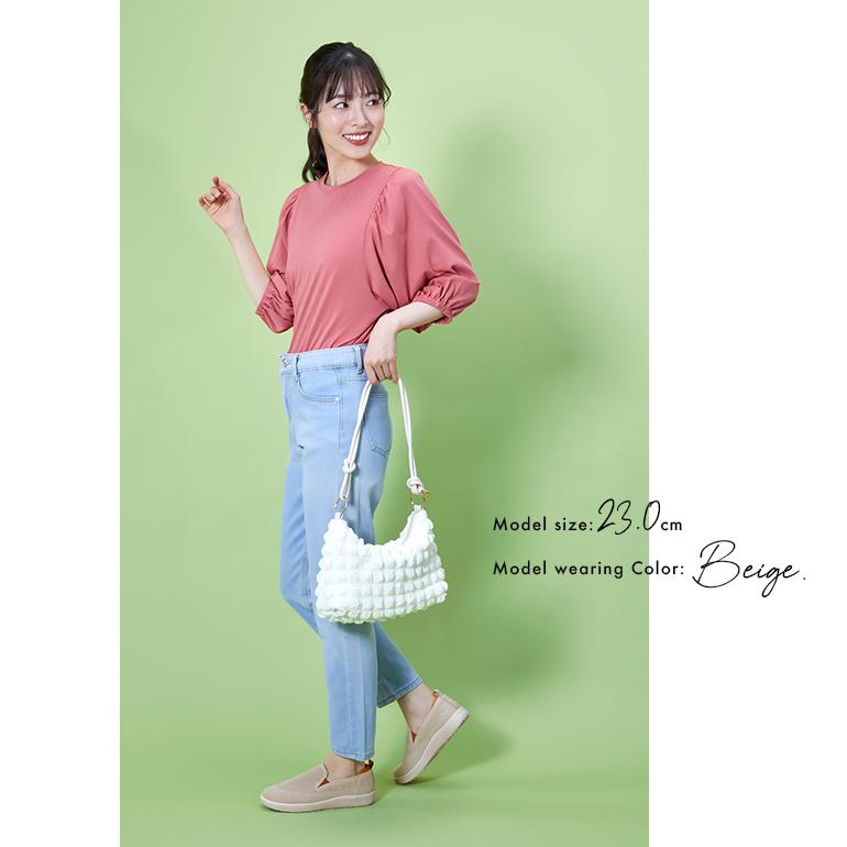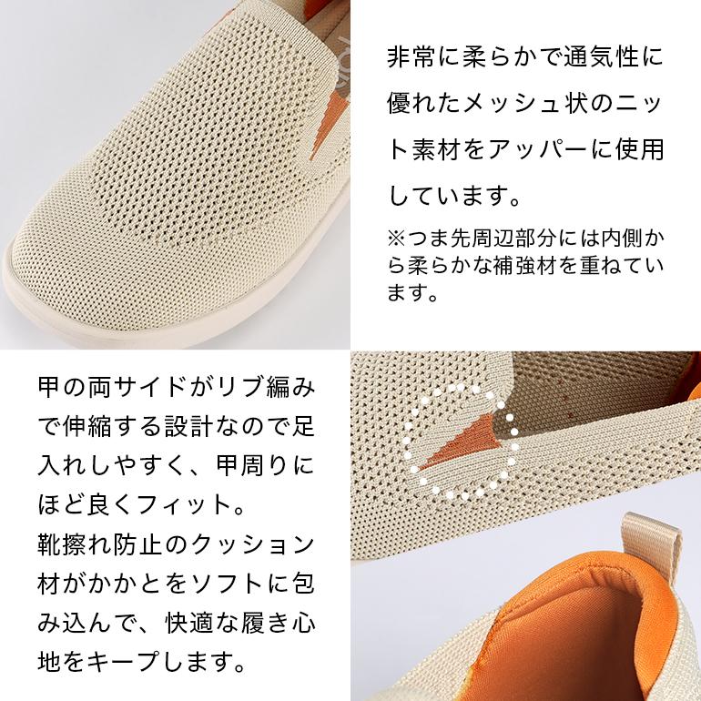 足あたり柔らかなニット素材を使用した楽ちんスリッポンシューズ。弾力性に優れたソールとふんわりクッションインソールのサポートで、一日中軽やかな歩き心地♪