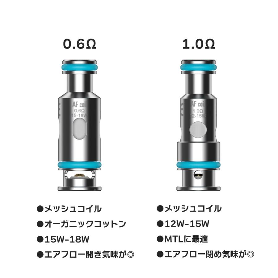 ●Aspire AF Meshコイル 5個入り●aspire Flexus Q PODに対応●0.6Ω・1.0Ωの2種類がラインナップ!メッシュコイルらしい濃厚でシルキーなミストが楽しめます!対応商品●Aspire Flexus Q POD内容量●5個