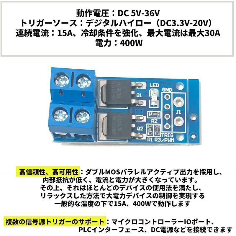動作電圧:DC 5V-36V; トリガーソース:デジタルハイロー(DC3.3V-20V); 連続電流:15A、冷却条件を強化、最大電流は最大30A。 電力:400W