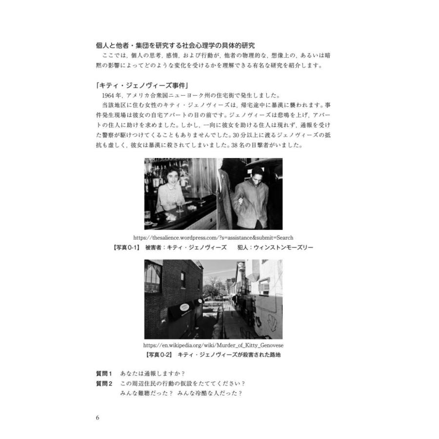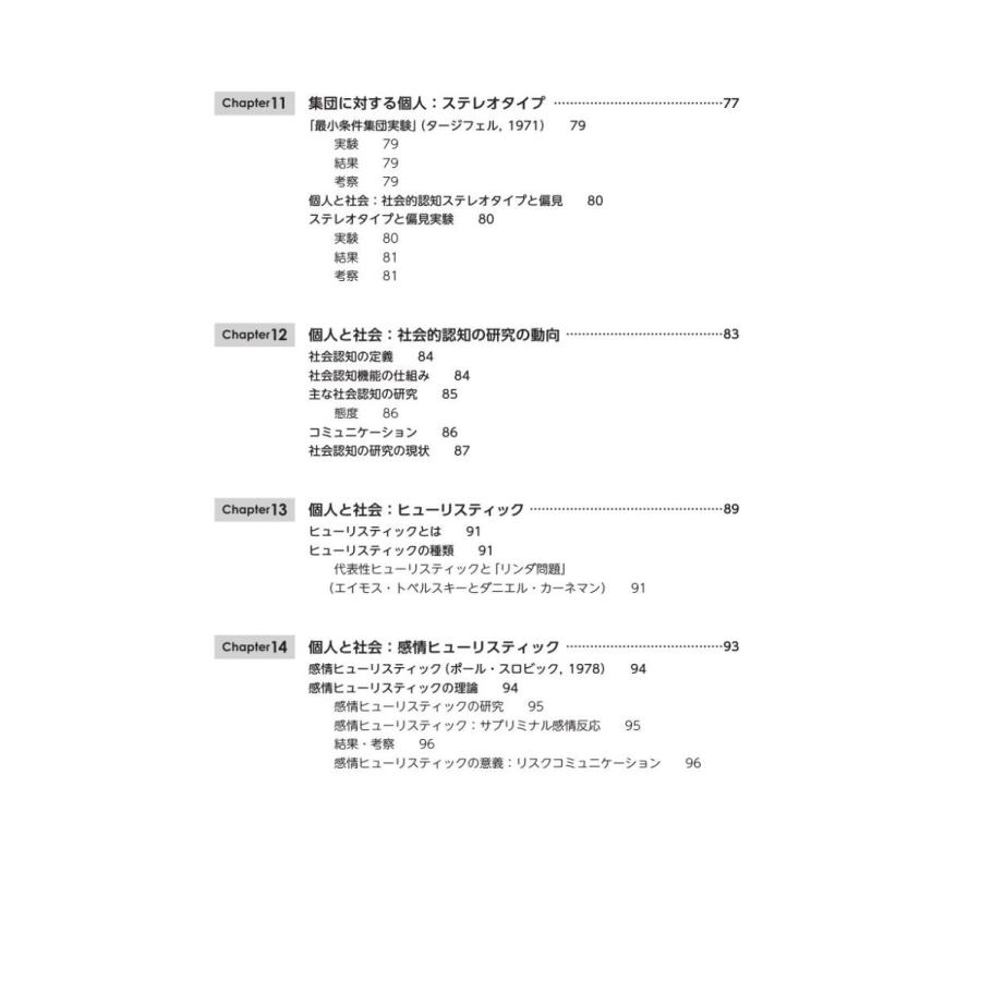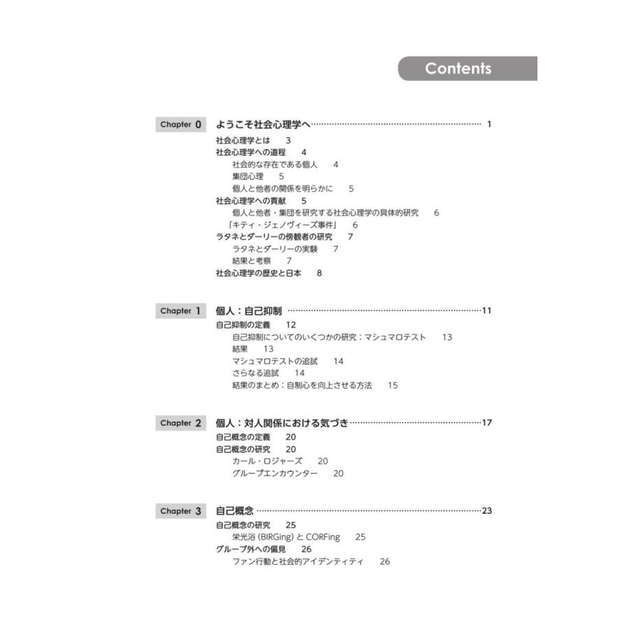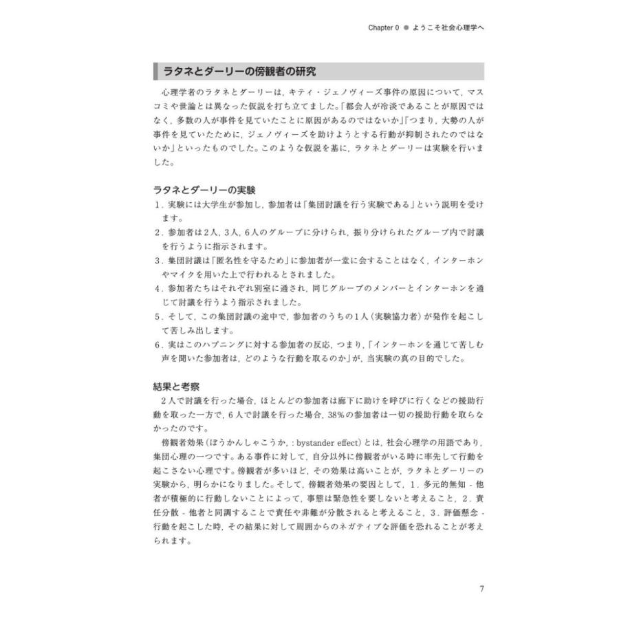 本書では,社会心理学における有名な実験や,社会心理学が発展したきっかけとなった出来事を通して,個人が社会をどのように見ているかを一緒に考えていきます。具体的には、導入問題では,社会心理学の実験のきっかけとなった,社会的出来事を紹介します。しかし,世界の中に,社会心理学だけでは問題の解決にいたらないことがたくさんあります。復習問題では,現在の社会における人の心の課題や現状を考えられるように工夫しました。また,社会心理学と臨床心理学はかけ離れているようですが,筆者は臨床心理士の資格をもつ研究者です。随所に,社会問題のヒントになるように人々の健康的な行動を促すように臨床心理士としての見方・助言が挿入されています。