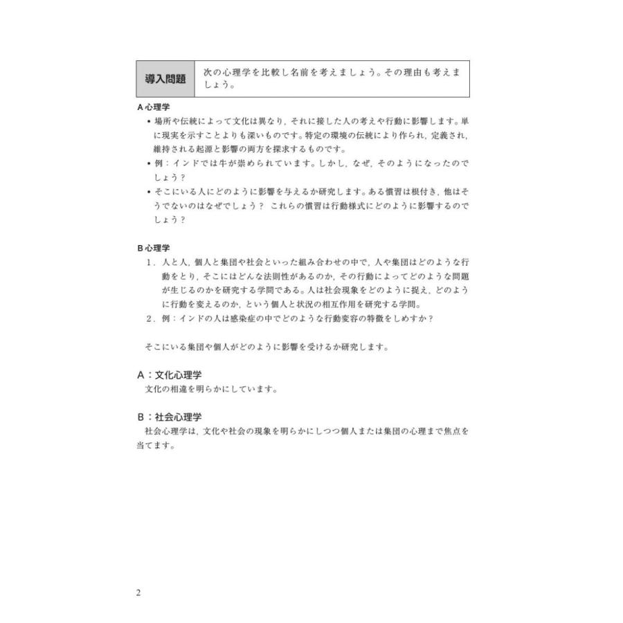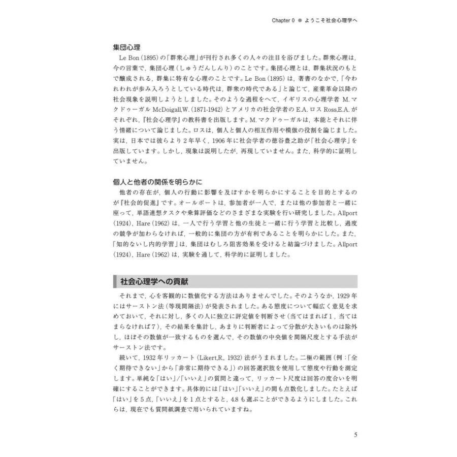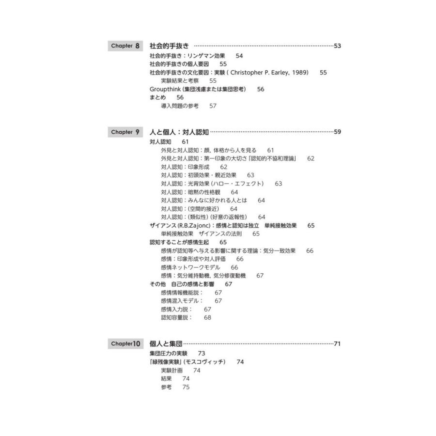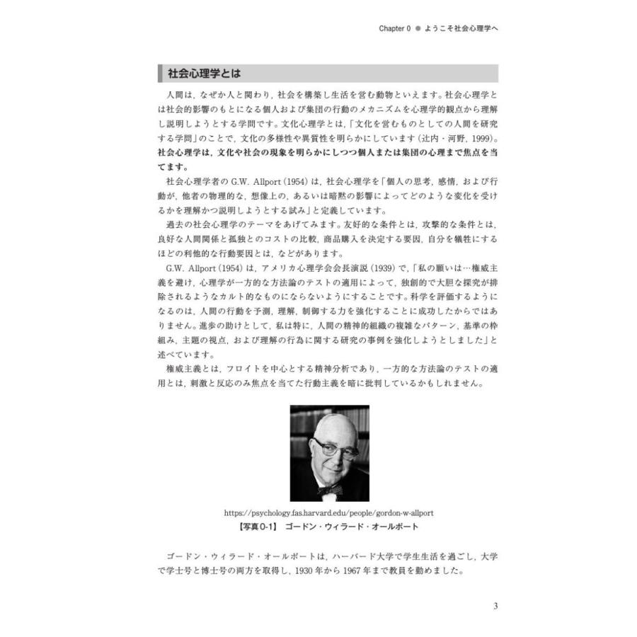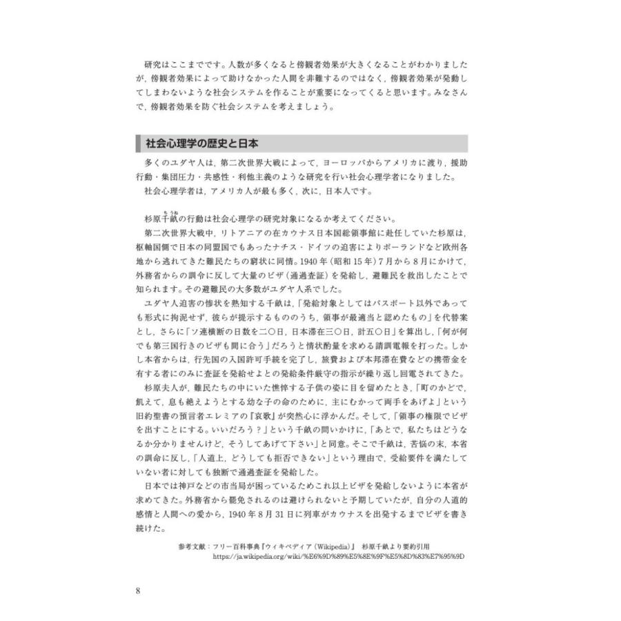 本書では,社会心理学における有名な実験や,社会心理学が発展したきっかけとなった出来事を通して,個人が社会をどのように見ているかを一緒に考えていきます。具体的には、導入問題では,社会心理学の実験のきっかけとなった,社会的出来事を紹介します。しかし,世界の中に,社会心理学だけでは問題の解決にいたらないことがたくさんあります。復習問題では,現在の社会における人の心の課題や現状を考えられるように工夫しました。また,社会心理学と臨床心理学はかけ離れているようですが,筆者は臨床心理士の資格をもつ研究者です。随所に,社会問題のヒントになるように人々の健康的な行動を促すように臨床心理士としての見方・助言が挿入されています。