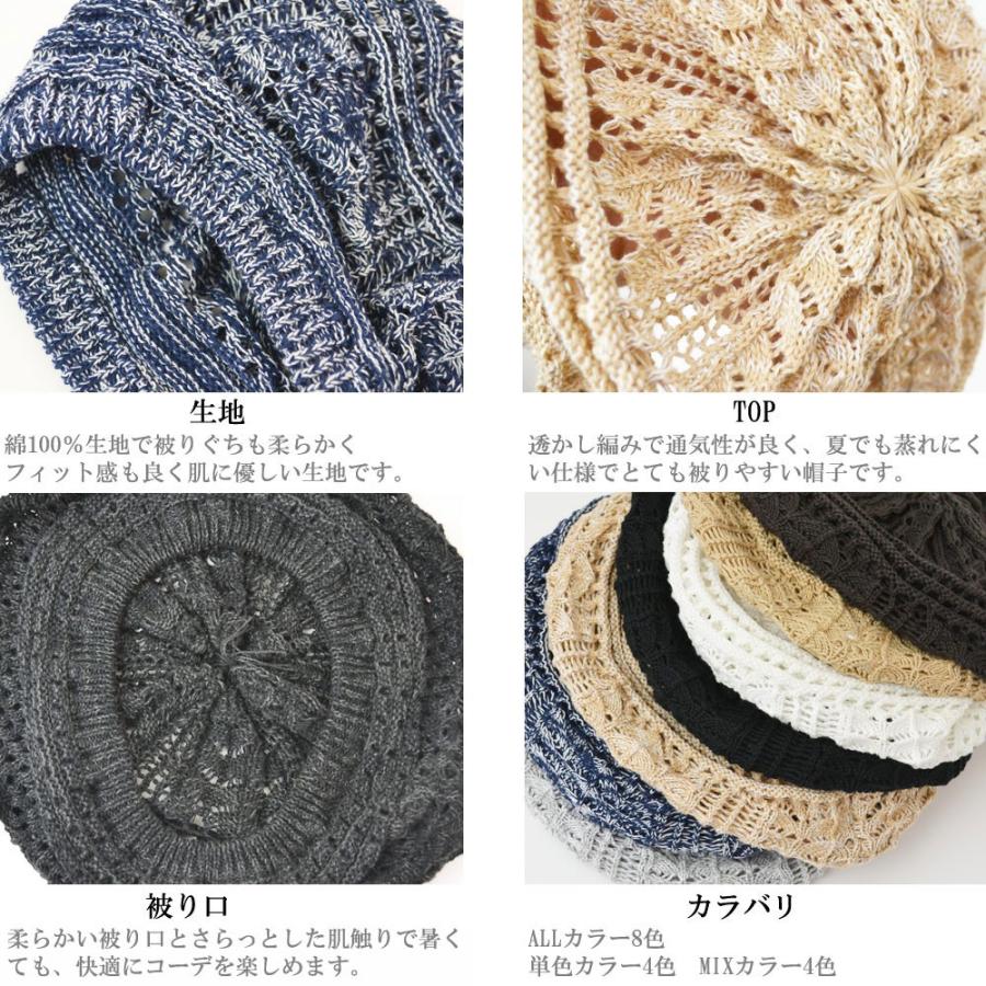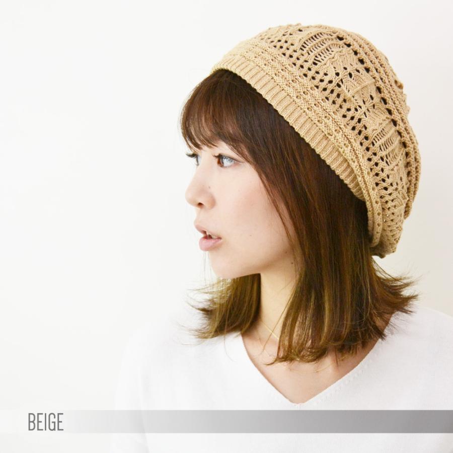 オシャレ度をアップさせてくれる模様編みのサマーニット透かしベレー帽です。被り方をアレンジして楽しんでください。サマーニットを透かし編みで仕上げたので、蒸れにくく春夏に安心してご着用いただけます。サイズ:フリーサイズ素材:コットン100%※メール便発送の場合ラッピングはできませんので予めご了承ください。
