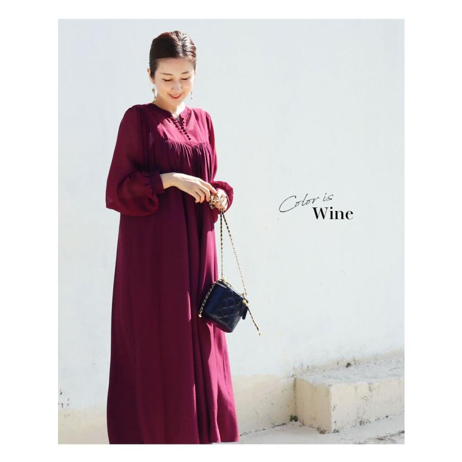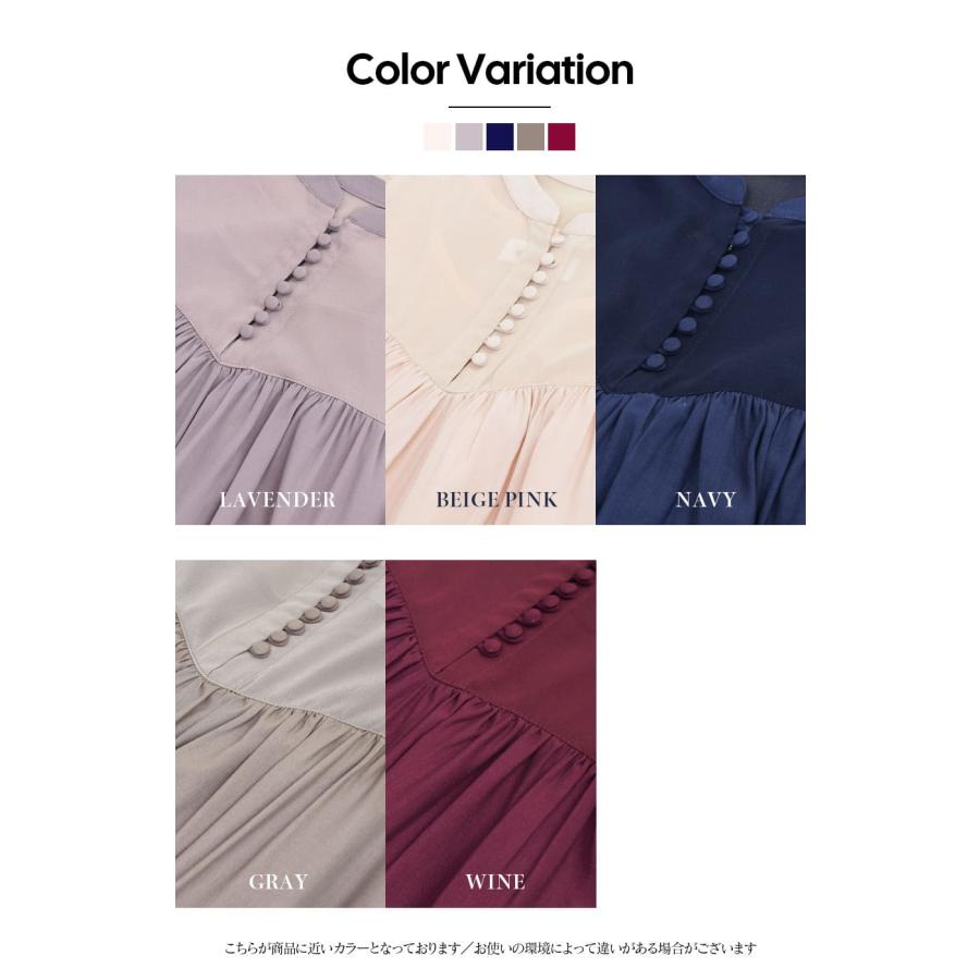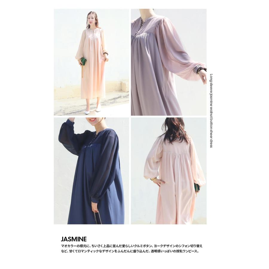 マオカラーの襟元に、ちいさく上品に並んだ愛らしいクルミボタン、ヨークデザインのシフォン切り替えなど、甘くてロマンティ