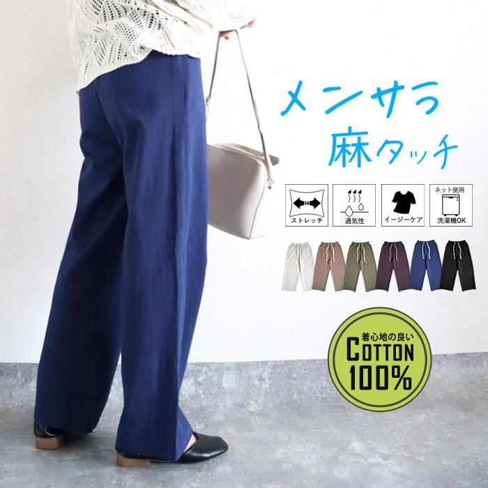 パンツ レディース 麻タッチ コットン100% 綿100% 選べる丈 低身長 9分丈 10分丈 高身長 ウエスト紐 刺繍紐 ストレートパンツ ワイドパンツ ウエストゴム ポケット付 麻風 春 夏 白 黒 おしゃれ 体型カバー 無地 シンプル 40代 30代 50代 60代 大きいサイズ ゆったり 大人 カジュアル かわいい SALE セール uricca ウリッカ うりっか ポイント利用