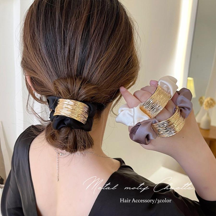 【商品説明】メタル素材のゴールドモチーフが大人かわいいヘアシュシュ。さっと髪の毛を結ぶだけでメタルモチーフがアクセントとなり、大人のおしゃれヘアスタイルに♪