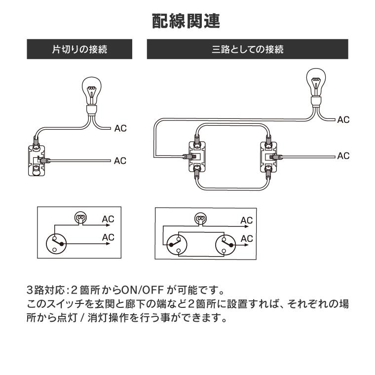 3路対応なのでこのスイッチを玄関と廊下の端など2箇所に設置すれば、それぞれの場所から点灯/消灯操作を行う事ができます。階段の上と下に設置するのもおすすめです。