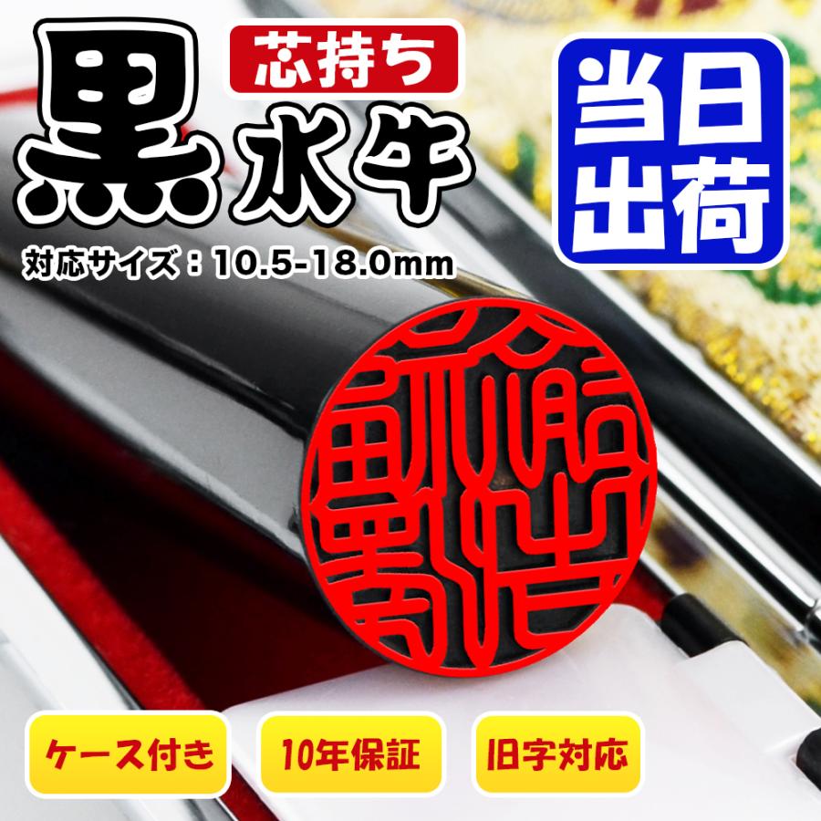黒水牛上芯持印鑑は、耐久性・硬度・粘りにも優れ、印鑑の篆刻には大変に適した材質です。芯に最も近い部分で、この芯もち部分を使用した黒水牛印鑑は最高級と言われています。