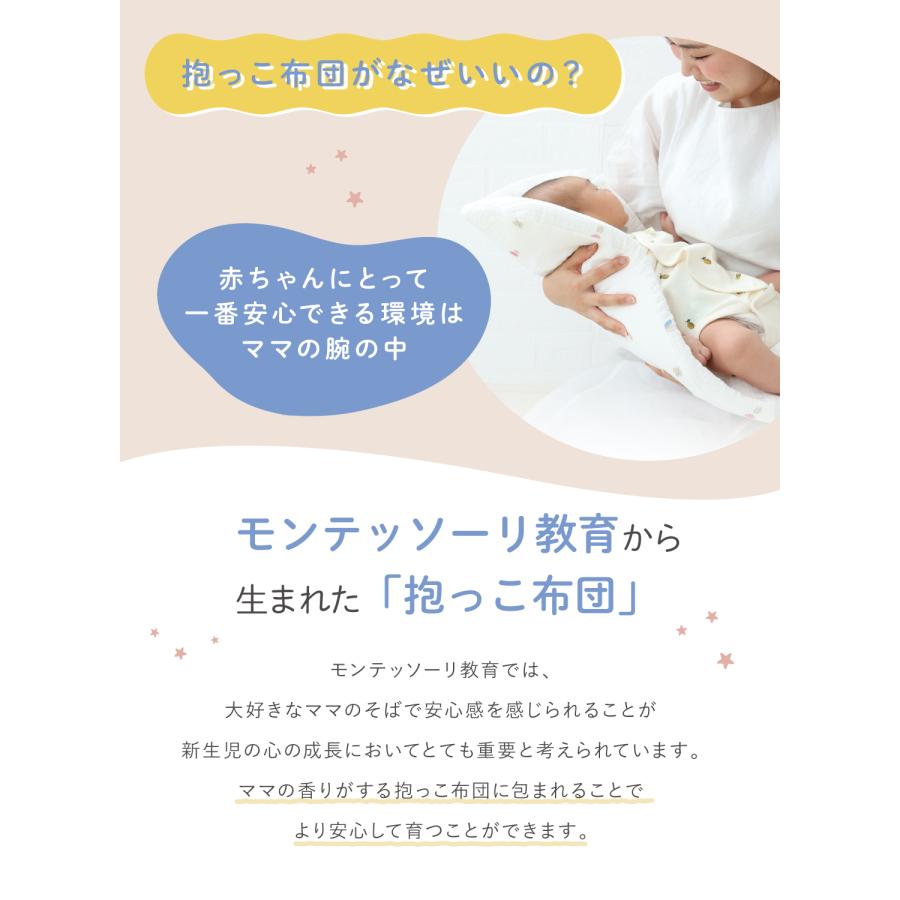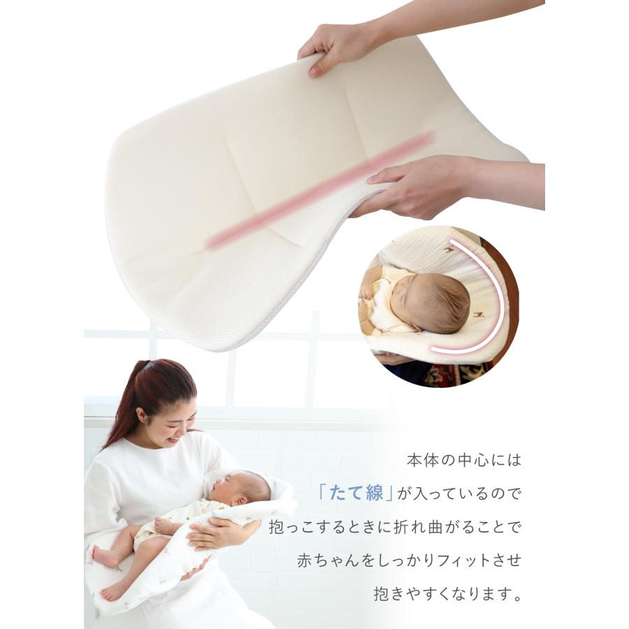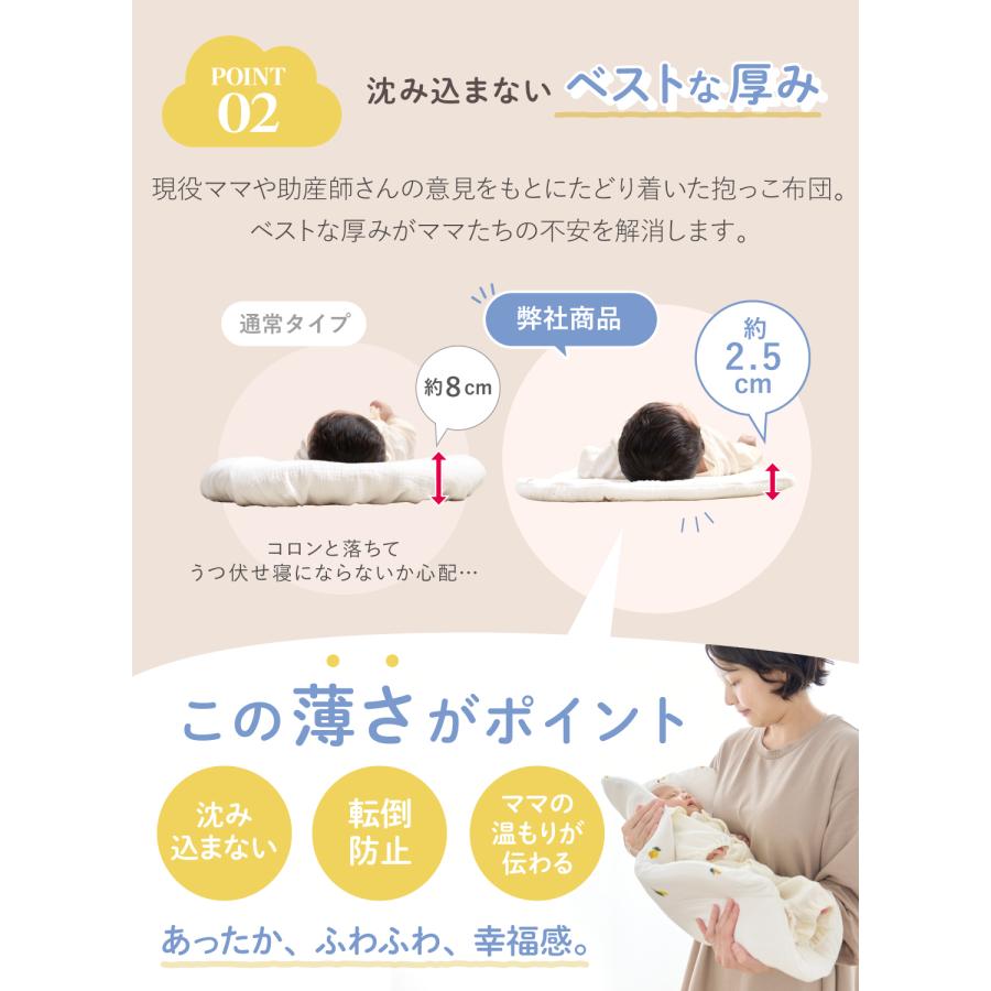 【程よい厚さ】厚すぎないので赤ちゃんを抱きやすく、沈み込み過ぎないから窒息などの事故も防げます。抱っこ布団で寝かしつけ、そのままお布団の上に置くのもOK。