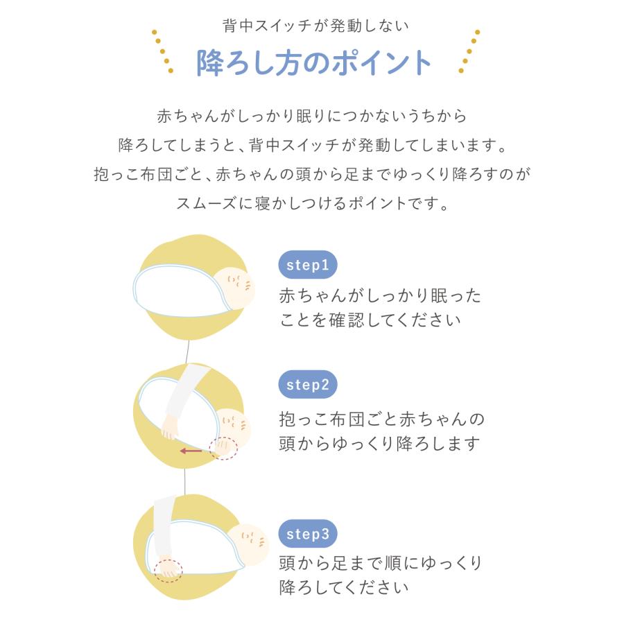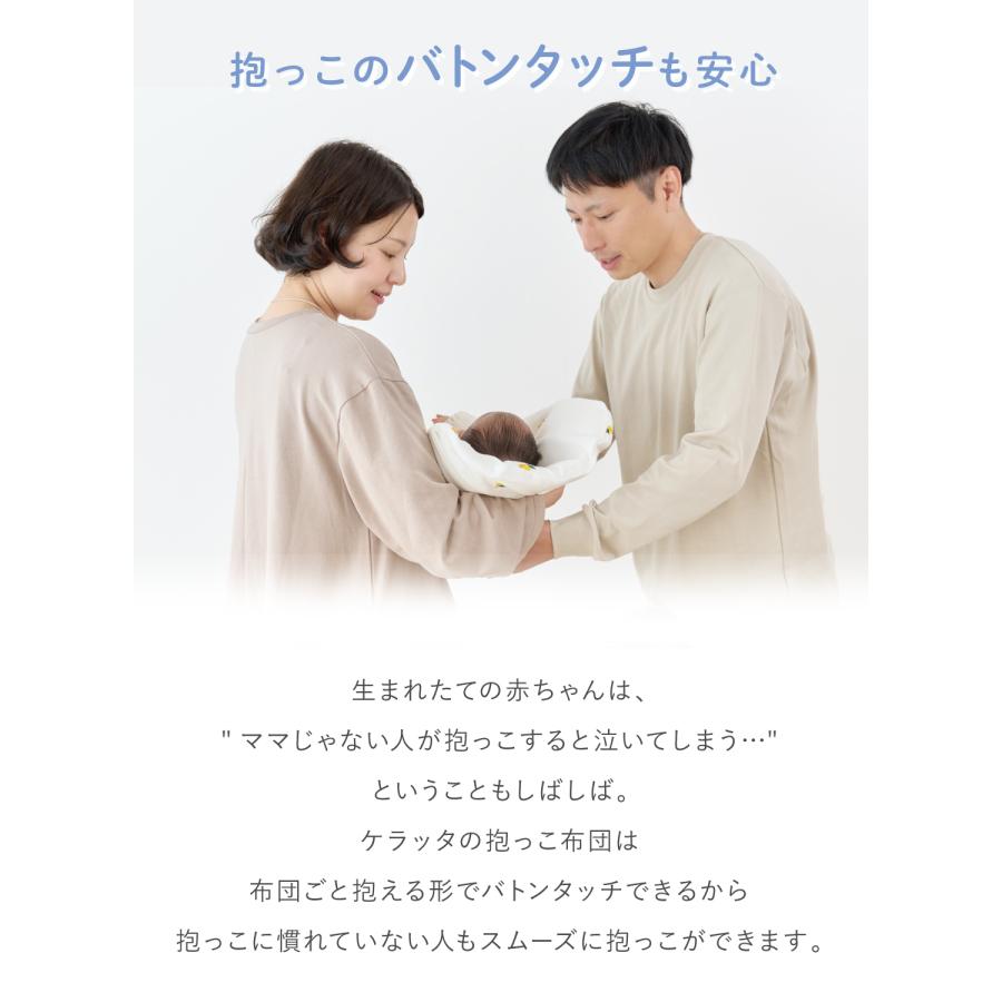 【大変な寝かしつけももう大丈夫!背中スイッチ対策に】赤ちゃんの背中はとっても敏感。ちょっとした変化も感じ取ってしまうので、お布団へ移動した瞬間に目を覚ましてしまいます。ケラッタの抱っこ布団は、そんな赤ちゃんの「背中スイッチ」が発動することなく、スムーズに寝かしつけができます。