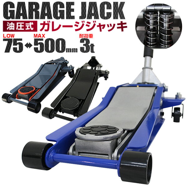 | 商品仕様 | 能力:3t デュアルポンプ式 最高位(約):500mm 最低位(約):75mm 材質:スチール製 カラー:ブラック、グレー、ブルー 本体サイズ(約):横690mm×幅268mm×高さ230mm 重量(約):33kg ハンドル高さ(約):1150mm |