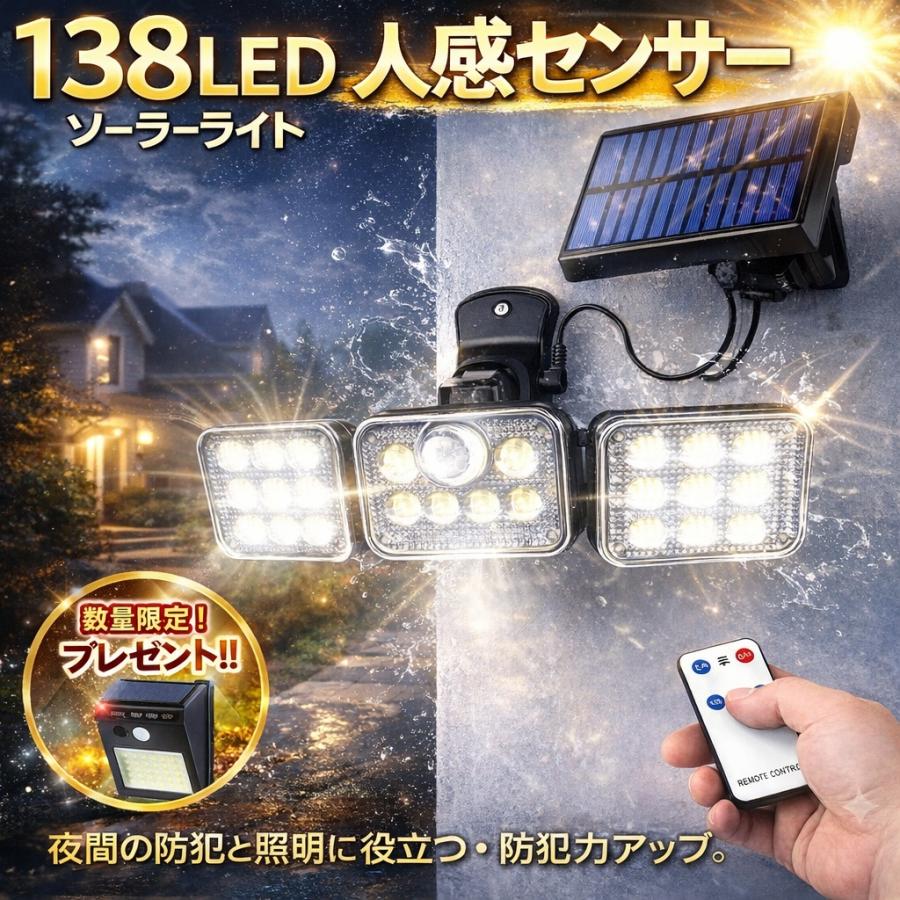 138個のLEDを搭載したIP65防水の人感センサー付きソーラーライト、リモコン付きで今だけ数量限定ミニソーラーセンサーライトもプレゼントいたします!