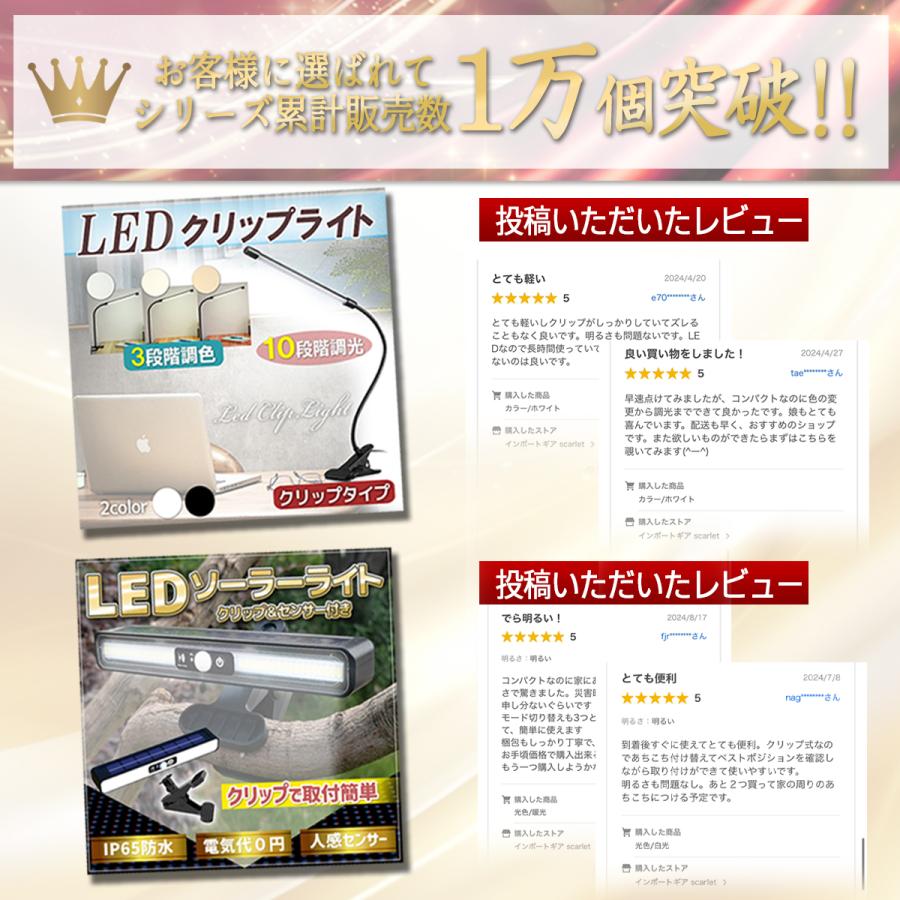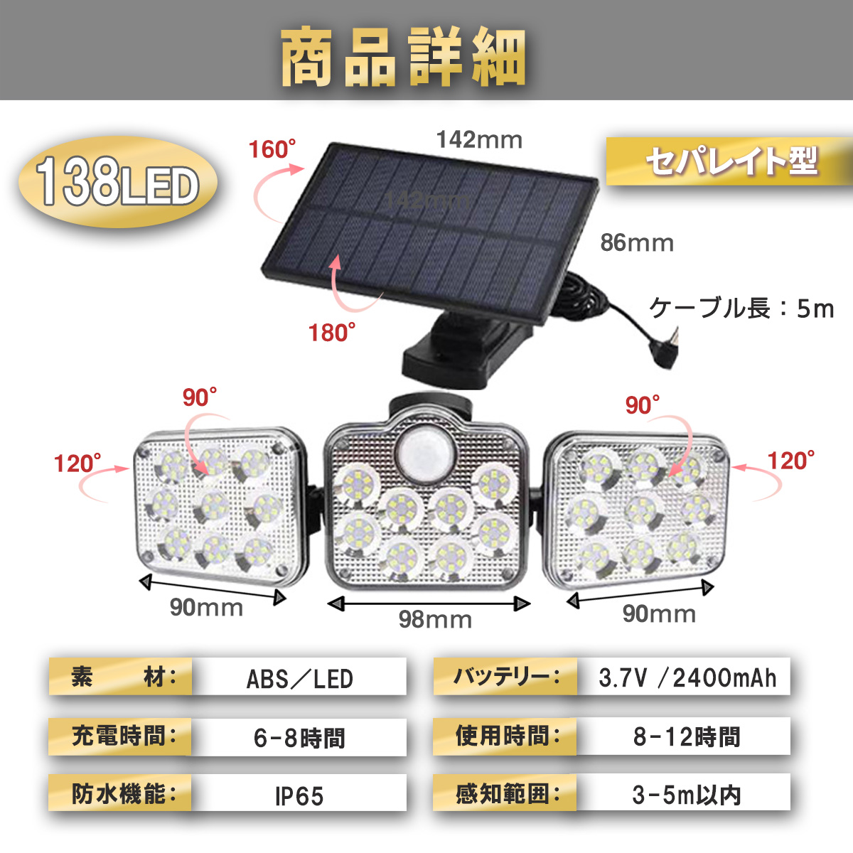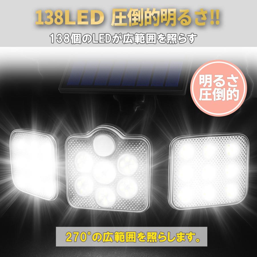 LEDチップを138個搭載され、最大270°の広範囲を照らします。自動消灯機能も備わっており、約15秒後に点灯を停止します。約8〜10時間使用できるため、夜間の防犯対策にも最適です。