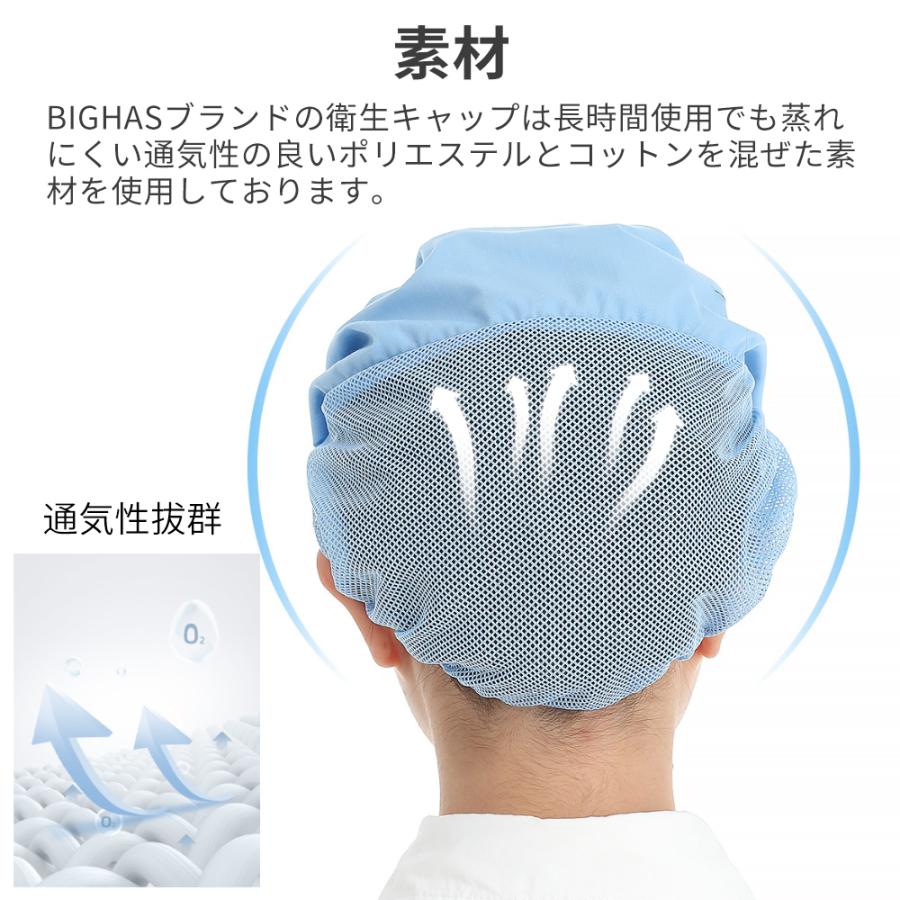 ●BIGHASブランドの衛生キャップは長時間使用でも蒸れにくい通気性の良いポリエステルとコットンを混ぜた素材を使用しております。軽くて汚れにくい、縮みにくい、ヨレにくい特徴もあります。
