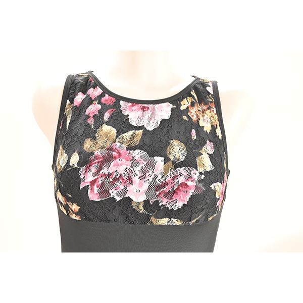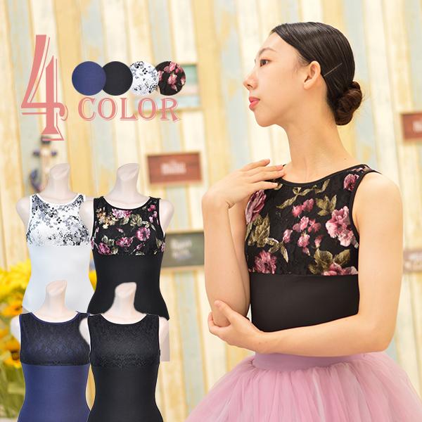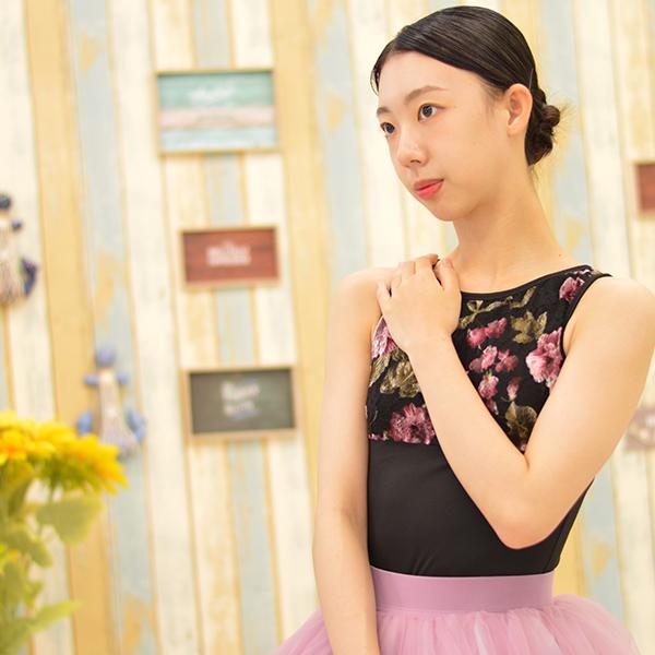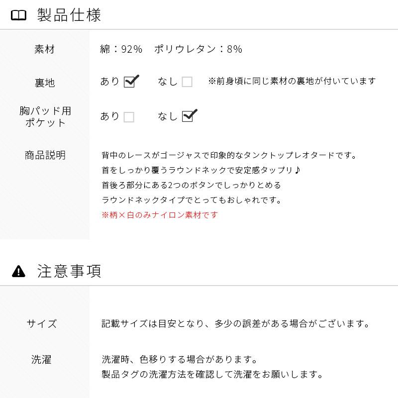 背中のレースがゴージャスで印象的なタンクトップレオタードです。首をしっかり覆うラウンドネックで安定感タップリ♪首後ろ部分にある2つのボタンでしっかりとめるラウンドネックタイプでとってもおしゃれです。