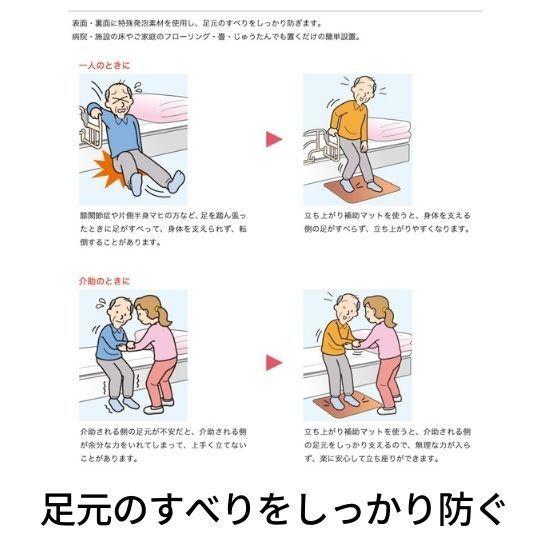 【製品の特長】・表面・裏面に特殊発砲素材を使用し、足元のすべりをしっかり防ぎます。・病院や・施設の床やご家庭のフローリング・畳・じゅうたんでも置くだけの簡単設置。・身体を支える側の足がすべらず、立ち上がりやすくなります。・介助される側の足元をしっかり支えるので、無理な力が入らず、楽に安心して立ち座りができます。【サイズ】幅55×奥行38×厚さ0.4cm【重量】約1.1kg【材質】表裏面:オレフィン系エラストマー、芯材:合成ゴム【カラー】ブラウン【メーカー名】アロン化成