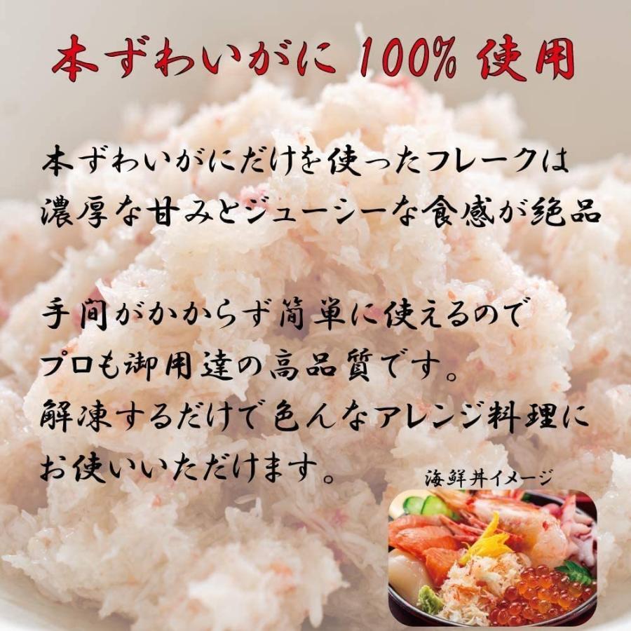 ●商品内容・ボイルずわいがにフレーク(ほぐし身)100g×5パック●賞味期限家庭用冷凍庫 約3ヶ月●保存方法冷凍庫で保存(要冷凍)●解凍方法冷蔵庫で自然解凍してください。解凍後はそのままでもお召し上がりいただけます。●調理方法かに鍋の〆の雑炊やかに丼ぶりなど●原材料カナダ産ボイルずわいがにズワイガニ(カナダ)、砂糖、食塩、還元水飴/pH調整剤(アミノ酸等)、増粘剤(キサンタンガム)※インドネシア加工
