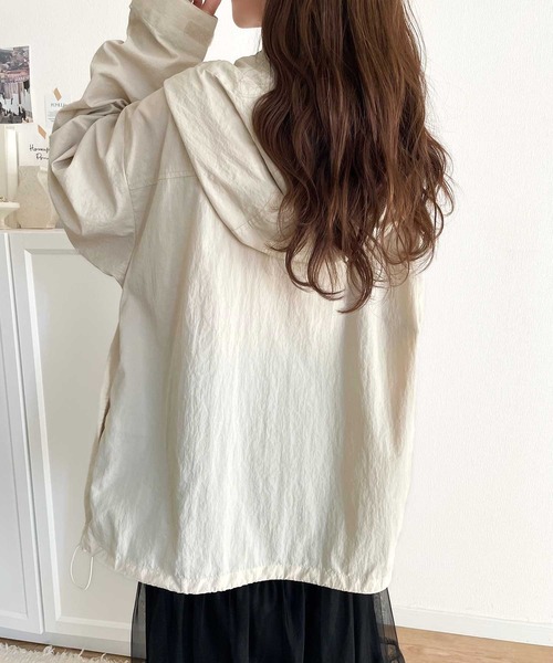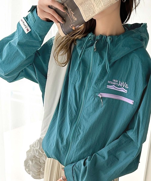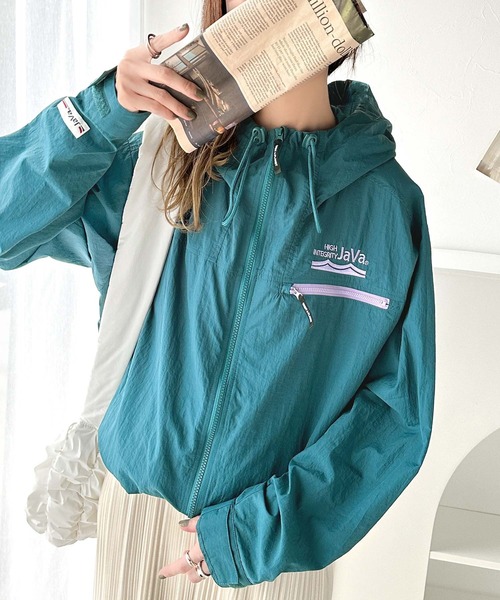 キーワード:ブルゾン ジャンバー レディース フード ロゴ 刺繍 無地 アウトドア ストリート スポーティー 雨 公園 春 大人カジュアル 定番 別注 コラボ
