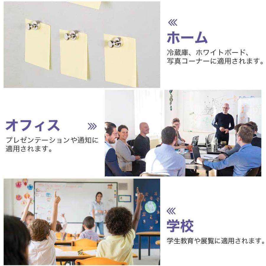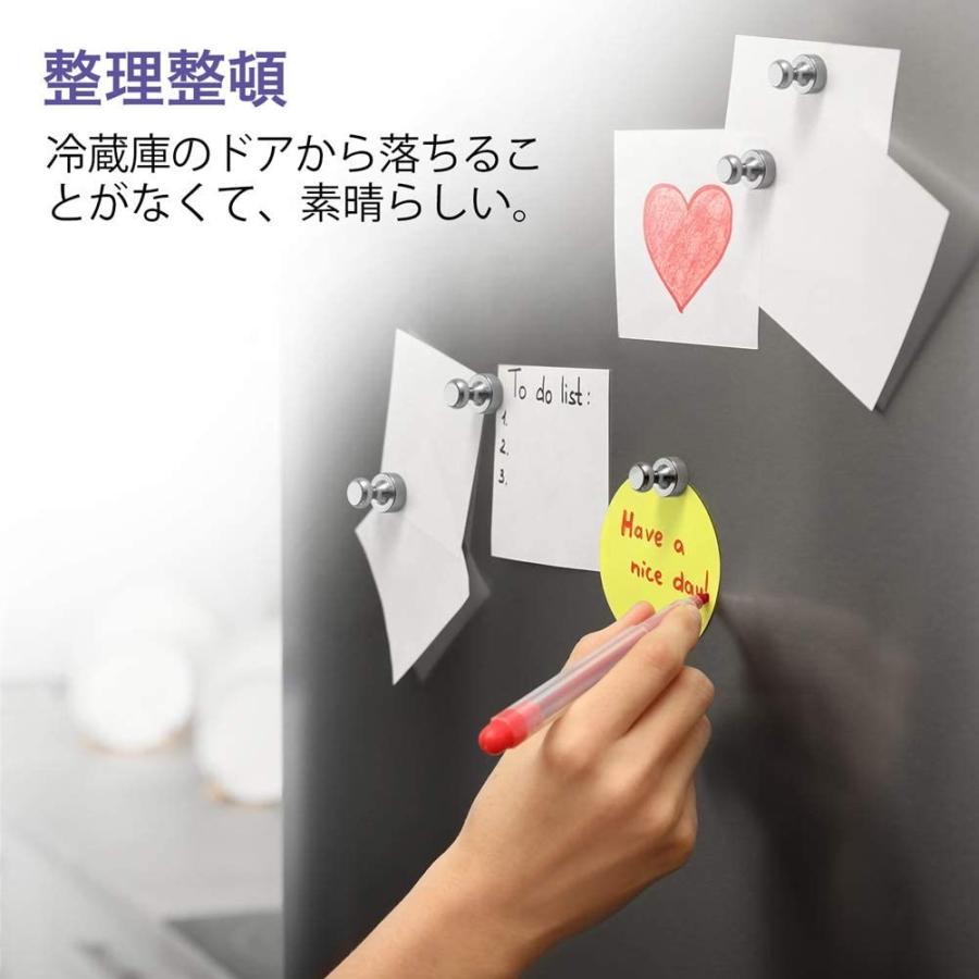 【超強力】超強力なマグネットピンは冷蔵庫、ホワイトボードにA4サイズの紙28枚固定できます。卓越した性能は、はるかに同類の製品を超え、取り付けや取り外しが簡単、迹や汚れが一切残らず。ニッケル - 銅 - ニッケルの3層メッキしたネオジウム磁石、長寿命です。ニッケルの最後の層はなにも傷つけない滑らかな表面を提供します。