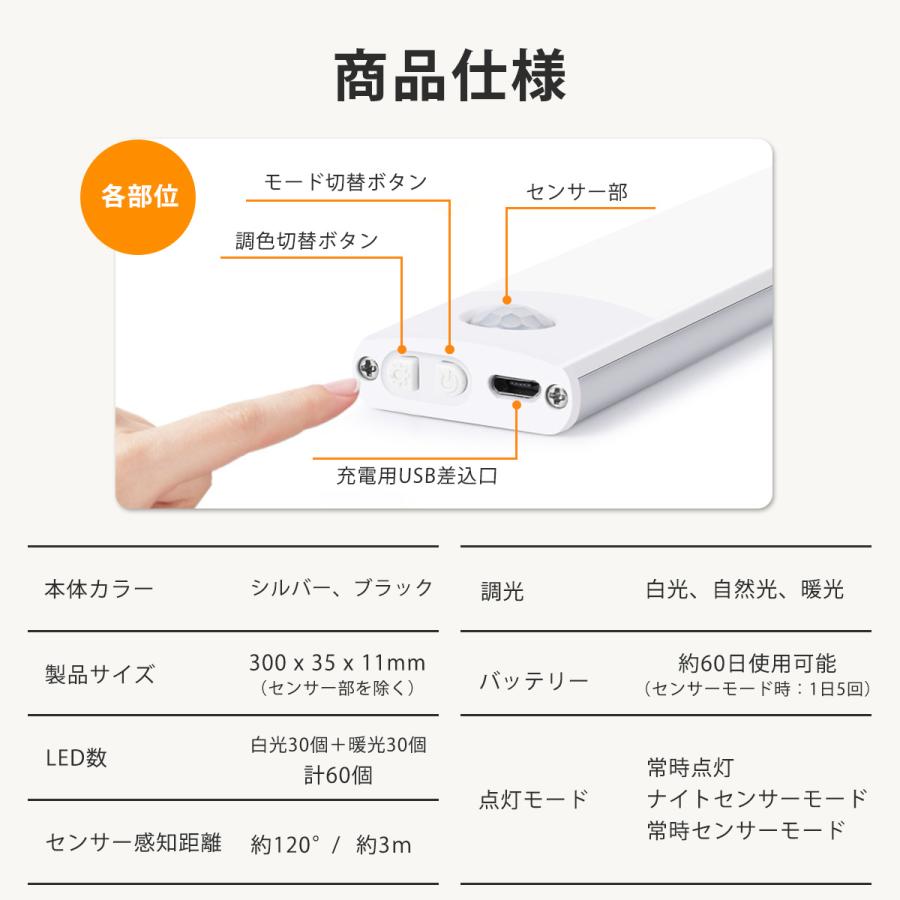 同梱品:センサーライト本体 設置用シール (2枚) 充電用USBケーブル 日本語説明書付き