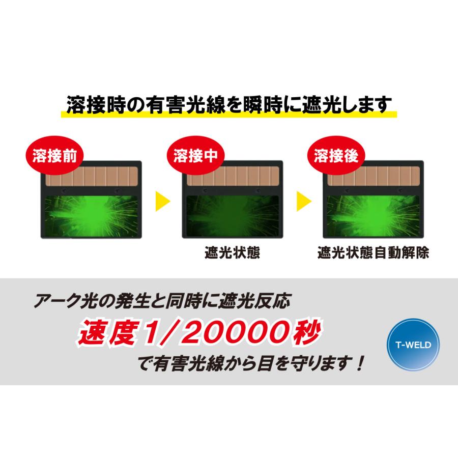 自動的に電源がON/OFFされます。アーク光の発生と同時に遮光(反応)速度1/20000秒で有害光線から目を守ります。