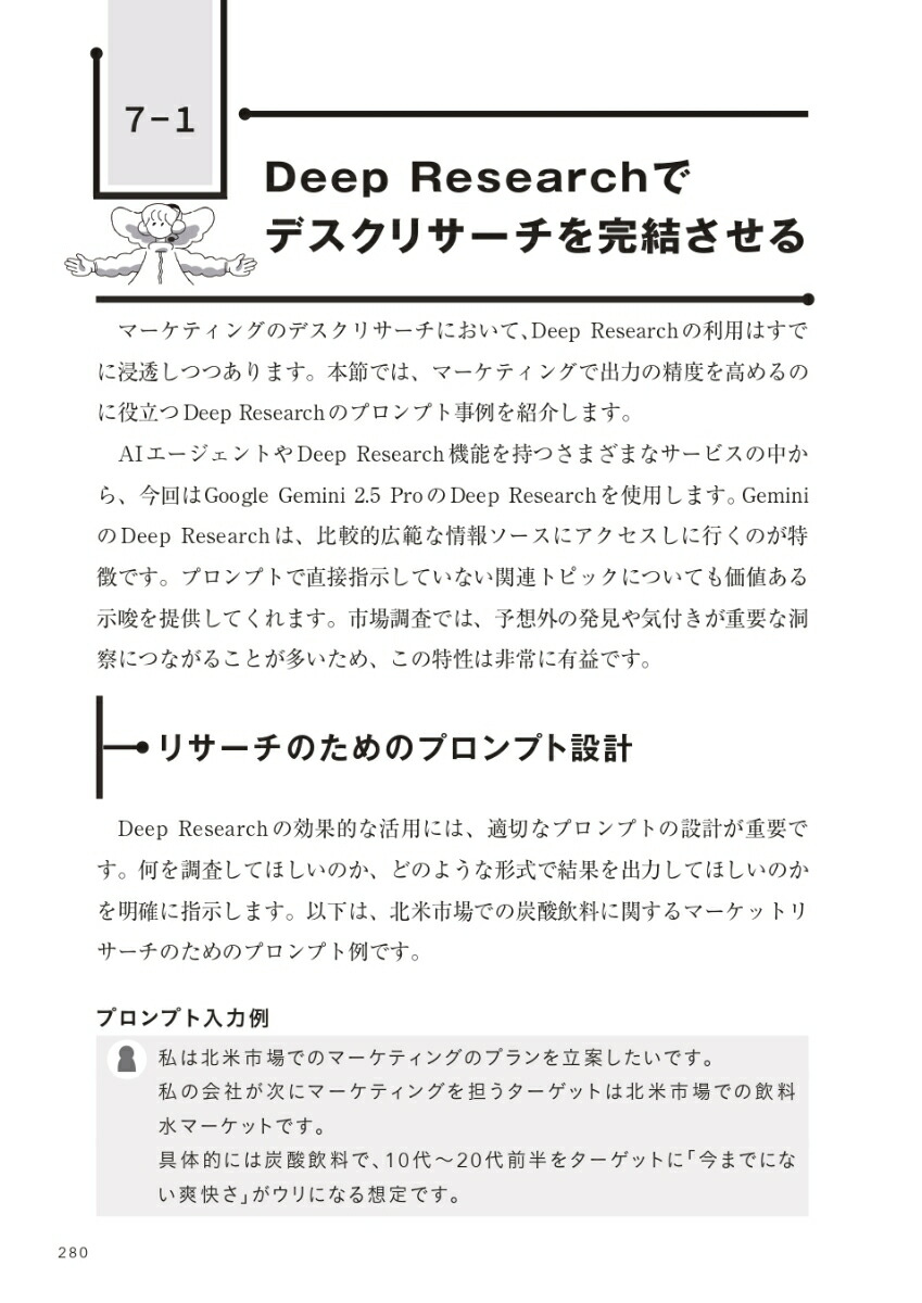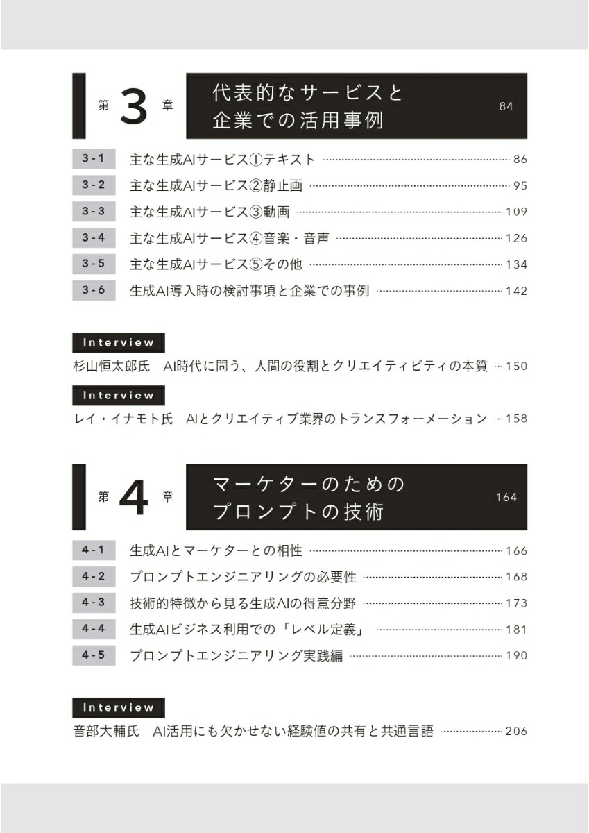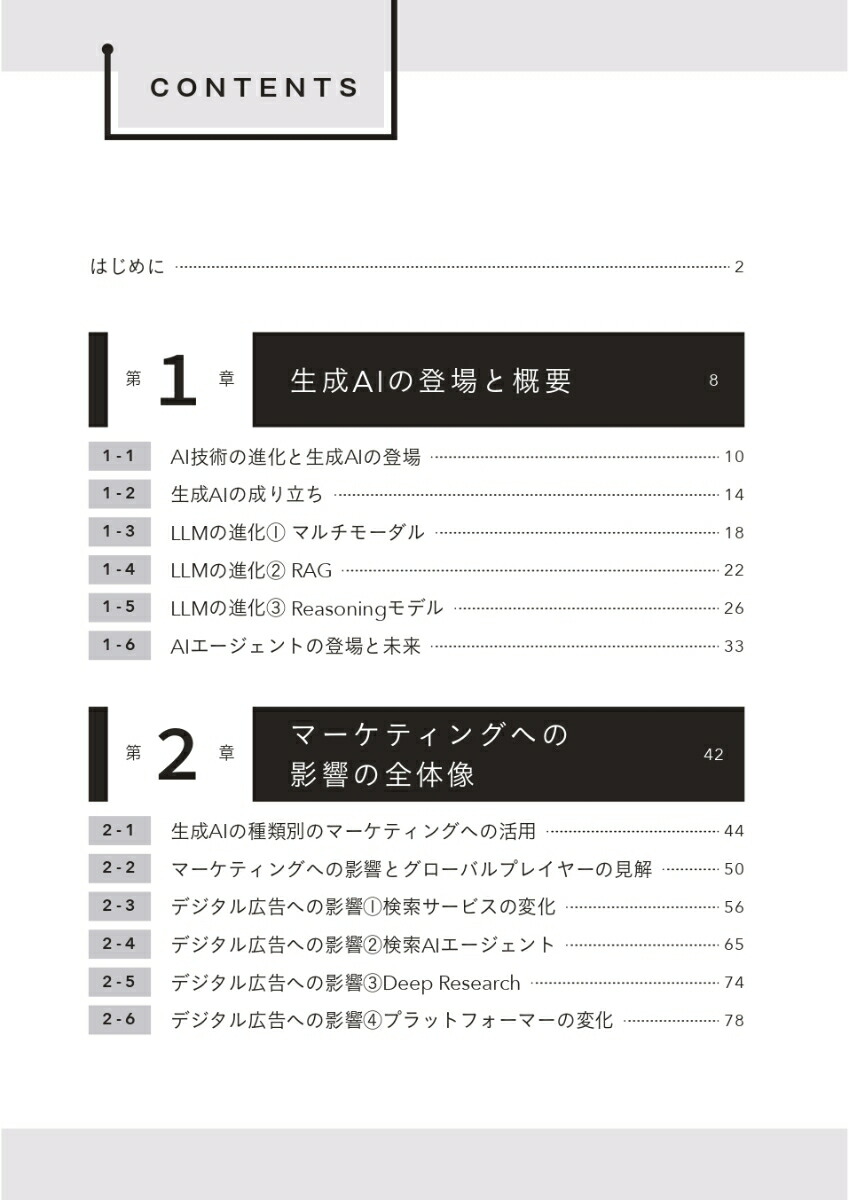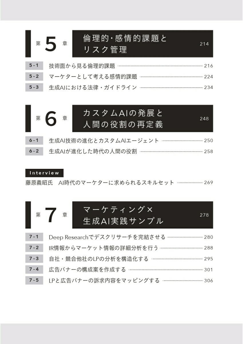 第1章 生成AIの登場と概要/第2章 マーケティングへの影響の全体像/第3章 代表的なサービスと企業での活用事例/第4章 マーケターのためのプロンプトの技術/第5章 倫理的・感情的課題とリスク管理/第6章 カスタムAIの発展と人間の役割の再定義/第7章 マーケティング×生成AI実践サンプル