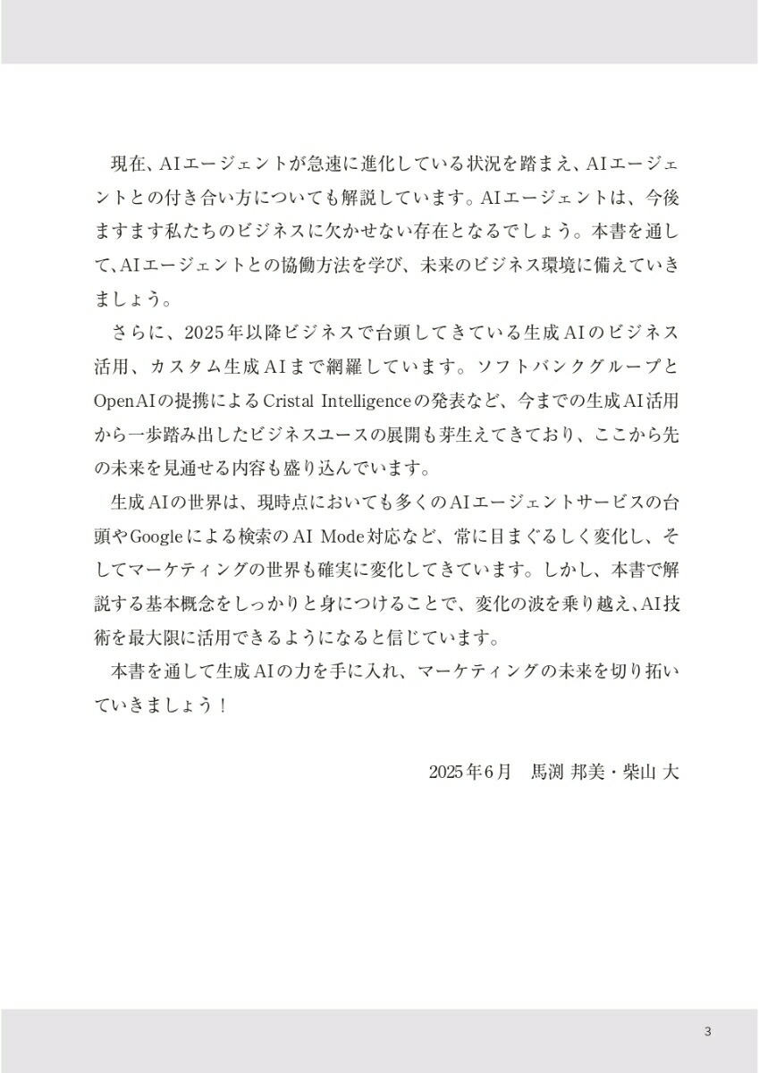 馬渕邦美(マブチクニヨシ)Xinobi AI株式会社 共同CEO。一般社団法人Metaverse Japan 代表理事。一般社団法人Generative AI Japan 代表理事。一般社団法人日本ディープラーニング協会 有識者会員。日本の産業界と世界を結ぶテクノロジー・グローバルビジネスリーダー。大学卒業後、米国のエージェンシー勤務を経て、デジタルエージェンシーのスタートアップを起業。事業を拡大しバイアウトした後、米国のメガ・エージェンシー・グループOgilvy One CEOにに転身。4社のCEOを歴任し、デジタルマーケティング業界で20年に及ぶトップマネジメントを経験。2018年にはFacebook Japan(Meta)のディレクターに就任し、Instagramの日本市場での成長を牽引。その後、PwCコンサルティングパートナー、デロイトトーマツコンサルティングパートナー:APAC TMT AI Leadを経て現職柴山大(シバヤマダイ)株式会社Hakuhodo DY ONE 常務執行役員。negocia株式会社 代表取締役。通信企業やWebメディア企業にてインターネットサービスの商品企画開発・マーケティング・UI/UXの責任者を務めた後、2017年にnegocia株式会社を創業し、代表取締役に就任。2019年、negociaと株式会社アイレップの資本業務提携に伴い、アイレップにてテクノロジー領域全般を統括。2022年より、アイレップ取締役CTOおよび株式会社博報堂テクノロジーズ執行役員を兼任し、博報堂DYグループにおけるAI開発を主導。2025年より、株式会社Hakuhodo DY ONE常務執行役員として、デジタル広告の領域を総合的にリードしている(本データはこの書籍が刊行された当時に掲載されていたものです)