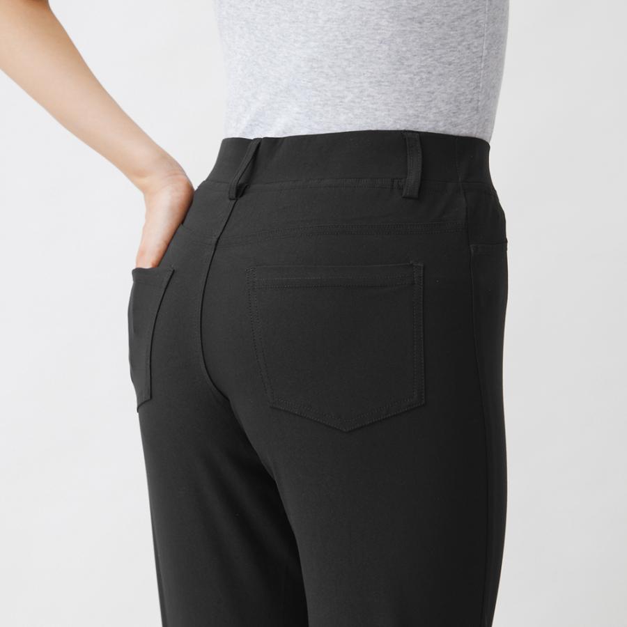 驚くほどよく伸びるストレッチ性とトップスを選ばないシンプルなデザインが人気の理由。アウターとして、きちんと見えるしっかりとした生地が特徴。より脚が美しく見えるようアンクル丈からフルレングス丈に改善!心地よいフィット感のウエストゴムなのに、トップスインしても美しい設計。スリムストレートで、体形を拾いすぎない美脚シルエット。
