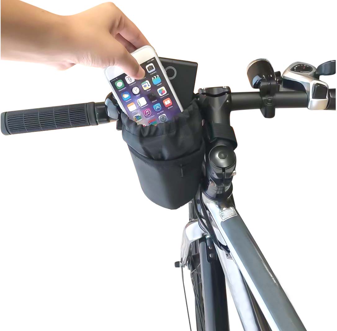 自転車用ハンドル取付けバイクポケット。小物からペットボトルまで大小さまざまなものが収納可能。●アジャスタブルベルト採用で上下左右に調整可能のため幅広い車種に対応●内側は保温・保冷に優れたアルミシート採用●出し入れ簡単・飛び出し防止の巾着仕様※デザイン・仕様などは予告なく変更・改良することがありますので、予めご了承ください。サイズ:ペットボトル、小物等カラー:ブラック容量・重量:約50g
