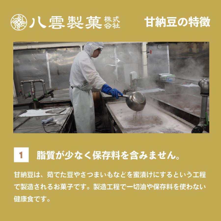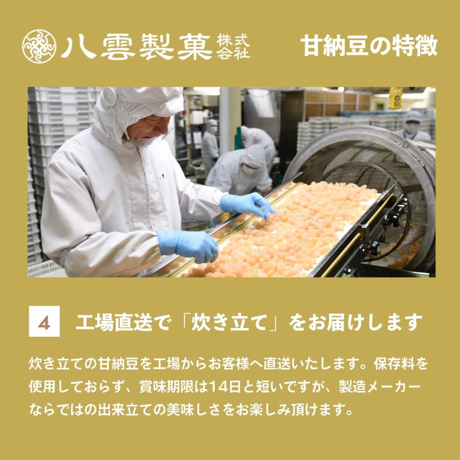 炊きたての甘納豆を袋詰めして、工場からお客様へ直送いたします。保存料を使用していない為、賞味期限は発送日から14日と短いですが、出来立てのお美味しさをそのままお楽しみいただけます。製造メーカーだから出来る、工場直送宅配サービスを是非お試しください。