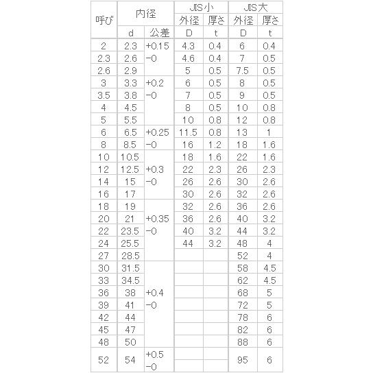 ■説明:小ねじやボルト等のねじと締め付ける相手材との間に入れることで相手材との接地面が大きくすることができます。またねじの締め付け時は回転しているので、その回転により相手材を傷つける事を防ぐためにワッシャーを入れる場合もあります。平座金や丸ワッシャーとも呼ばれています。平ワッシャーにはいろいろな規格があります。こちらは旧JIS規格(1963年)となりますがISO規格(旧JIS1978年)の平ワッシャーと区別する為にJISと表記しています。また小形丸を小、ミガキ丸を大と表記しています。